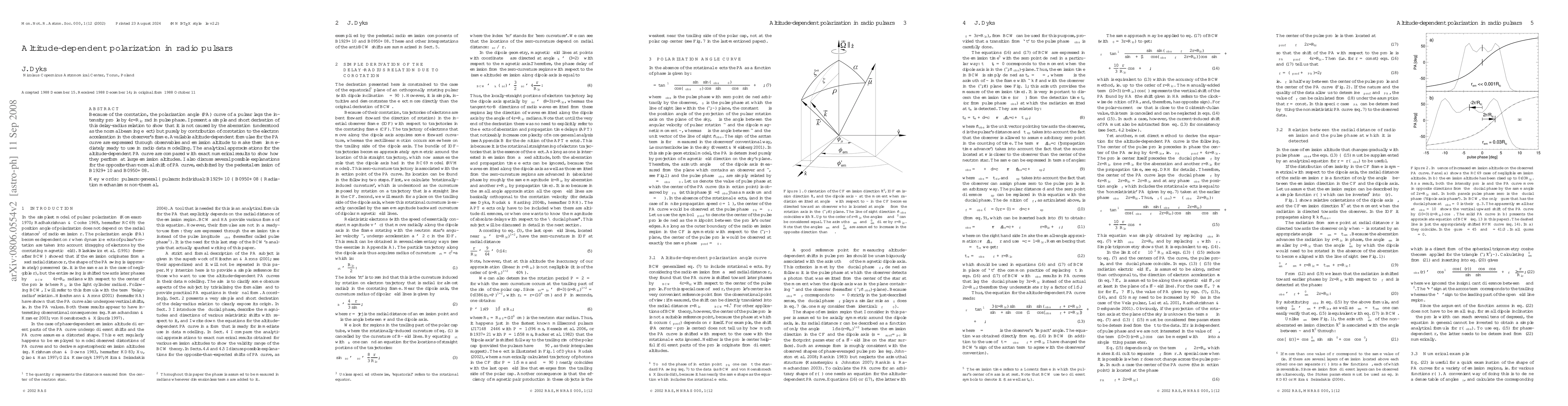 This paper presents a derivation of the delay between the polarization angle (PA) curve and intensity profile in radio pulsars, attributing this delay to corotation effects rather than aberration. It provides altitude-dependent formulae for the PA curve, compares analytical approximations with numerical results, and discusses unusual PA shifts observed in certain pulsars.