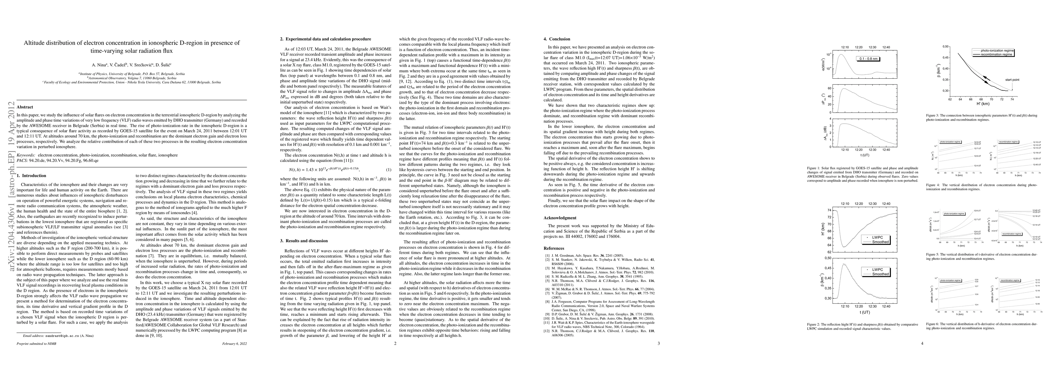 This paper investigates the impact of solar flares on electron concentration in the ionospheric D-region, using VLF radio wave data from a German transmitter and a Serbian receiver. It analyzes the photo-ionization and recombination processes at around 70 km altitude, revealing their relative contributions to electron concentration changes in response to solar flare activity.