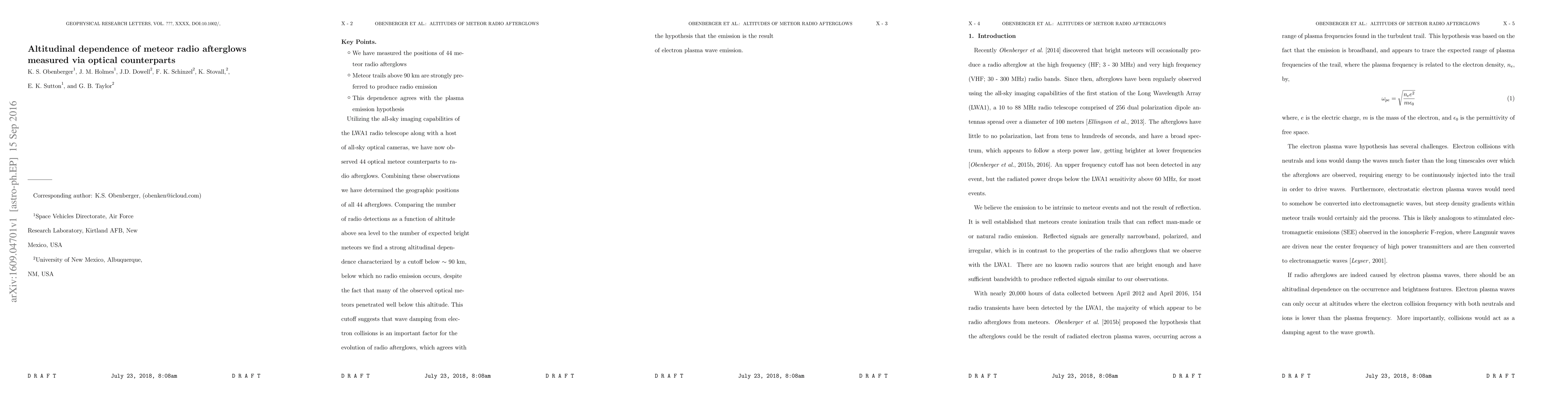 The research used LWA1 radio telescope and optical cameras to observe 44 optical meteor counterparts, finding a radio afterglow cutoff at around 90km altitude. This suggests electron collision damping significantly impacts radio afterglow evolution, supporting the hypothesis of plasma wave emission.