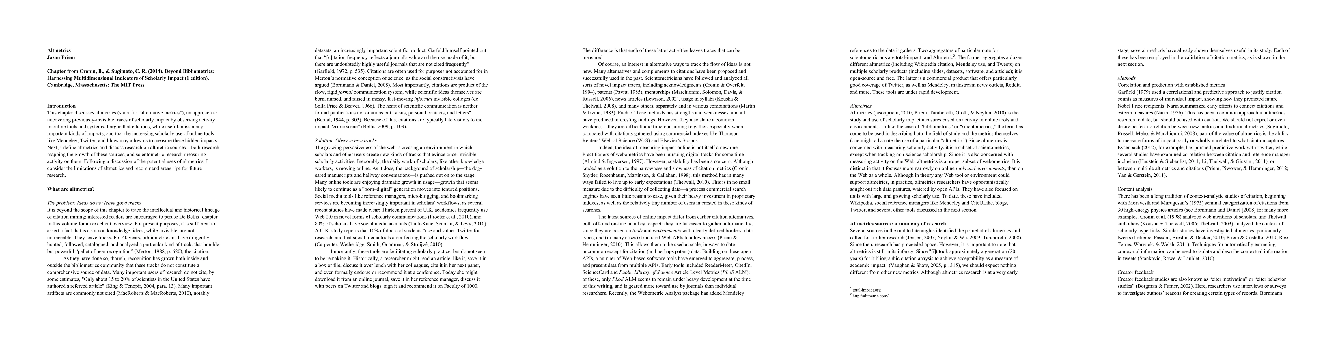 This chapter discusses altmetrics (short for "alternative metrics"), an approach to uncovering previously-invisible traces of scholarly impact by observing activity in online tools and systems. I argue that citations, while useful, miss many important kinds of impacts, and that the increasing scholarly use of online tools like Mendeley, Twitter, and blogs may allow us to measure these hidden impacts. Next, I define altmetrics and discuss research on altmetric sources--both research mapping the growth of these sources, and scientometric research measuring activity on them. Following a discussion of the potential uses of altmetrics, I consider the limitations of altmetrics and recommend areas ripe for future research.