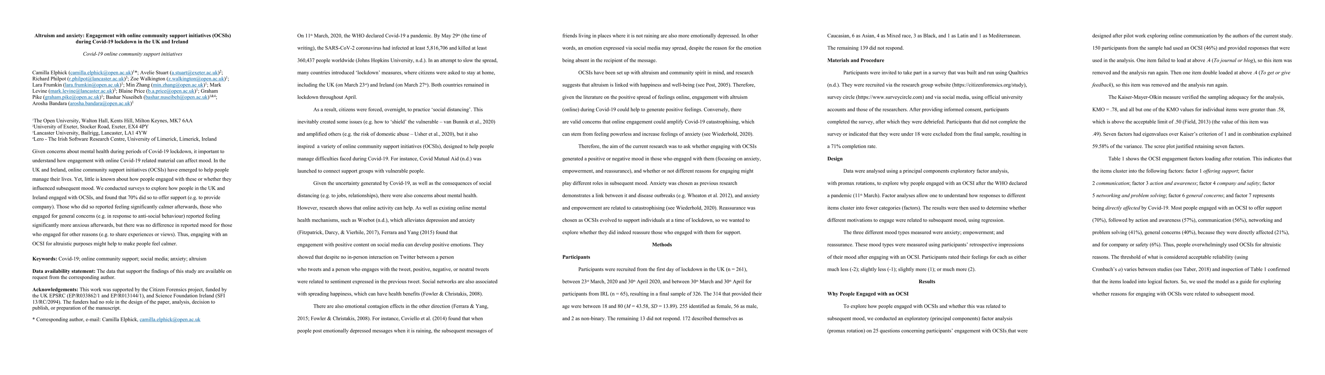 This study explores the impact of engagement with online community support initiatives (OCSIs) during Covid-19 lockdown in the UK and Ireland, finding that 70% of participants used these platforms to offer support, which significantly reduced their anxiety. Conversely, those who engaged due to general concerns reported increased anxiety, highlighting the mood-altering effects of altruistic versus non-altruistic interactions.