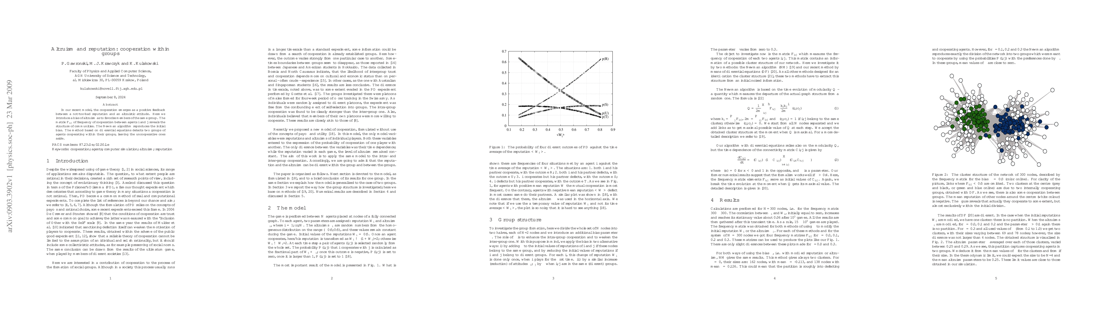 This research explores how altruism and reputation foster cooperation within groups, demonstrating that a positive feedback loop between good reputation and altruistic behavior leads to group-favoring cooperation. The study uses a matrix to model cooperation frequency and identifies two distinct groups of cooperative agents using differential equations and the Newman algorithm.