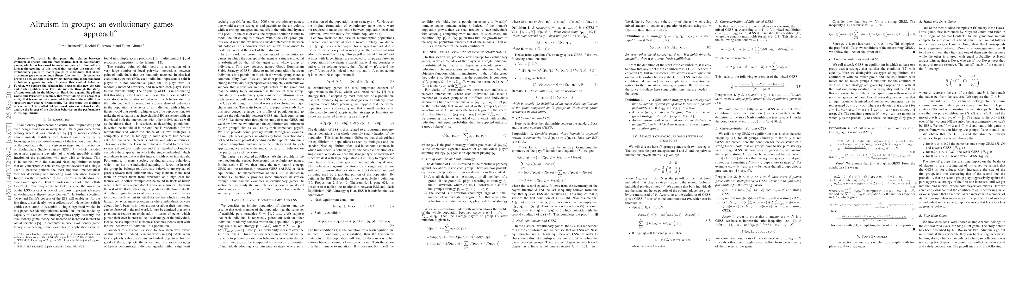 We revisit in this paper the relation between evolution of species and the mathematical tool of evolutionary games, which has been used to model and predict it. We indicate known shortcoming of this model that restricts the capacity of evolutionary games to model groups of individuals that share a common gene or a common fitness function. In this paper we provide a new concept to remedy this shortcoming in the standard evolutionary games in order to cover this kind of behavior. Further, we explore the relationship between this new concept and Nash equilibrium or ESS. We indicate through the study of some example in the biology as Hawk and Dove game, Stag Hunt Game and Prisoner Dilemma, that when taking into account a utility that is common to a group of individuals, the equilibrium structure may change dramatically. We also study the multiple access control in slotted Aloha based wireless networks. We analyze the impact of the altruism behavior on the performance at the equilibrium.