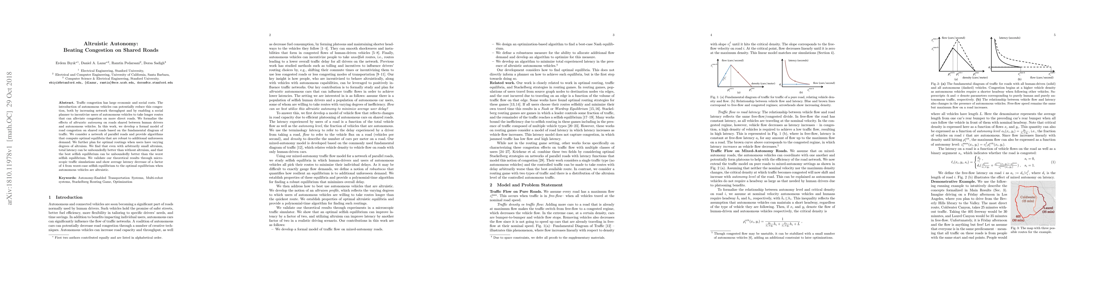 Traffic congestion has large economic and social costs. The introduction of autonomous vehicles can potentially reduce this congestion, both by increasing network throughput and by enabling a social planner to incentivize users of autonomous vehicles to take longer routes that can alleviate congestion on more direct roads. We formalize the effects of altruistic autonomy on roads shared between human drivers and autonomous vehicles. In this work, we develop a formal model of road congestion on shared roads based on the fundamental diagram of traffic. We consider a network of parallel roads and provide algorithms that compute optimal equilibria that are robust to additional unforeseen demand. We further plan for optimal routings when users have varying degrees of altruism. We find that even with arbitrarily small altruism, total latency can be unboundedly better than without altruism, and that the best selfish equilibrium can be unboundedly better than the worst selfish equilibrium. We validate our theoretical results through microscopic traffic simulations and show average latency decrease of a factor of 4 from worst-case selfish equilibrium to the optimal equilibrium when autonomous vehicles are altruistic.