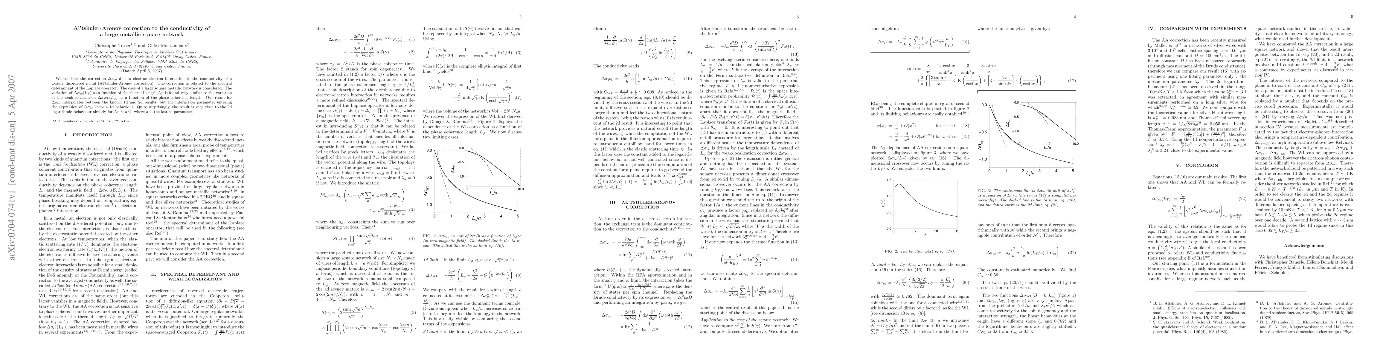 We consider the correction $\Delta\sigma_\mathrm{ee}$ due to electron-electron interaction to the conductivity of a weakly disordered metal (Al'tshuler-Aronov correction). The correction is related to the spectral determinant of the Laplace operator. The case of a large square metallic network is considered. The variation of $\Delta\sigma_\mathrm{ee}(L_T)$ as a function of the thermal length $L_T$ is found very similar to the variation of the weak localization $\Delta\sigma_\mathrm{WL}(L_\phi)$ as a function of the phase coherence length. Our result for $\Delta\sigma_\mathrm{ee}$ interpolates between the known 1d and 2d results, but the interaction parameter entering the expression of $\Delta\sigma_\mathrm{ee}$ keeps a 1d behaviour. Quite surprisingly, the result is very close to the 2d logarithmic behaviour already for $L_T\sim{a}/2$, where $a$ is the lattice parameter.