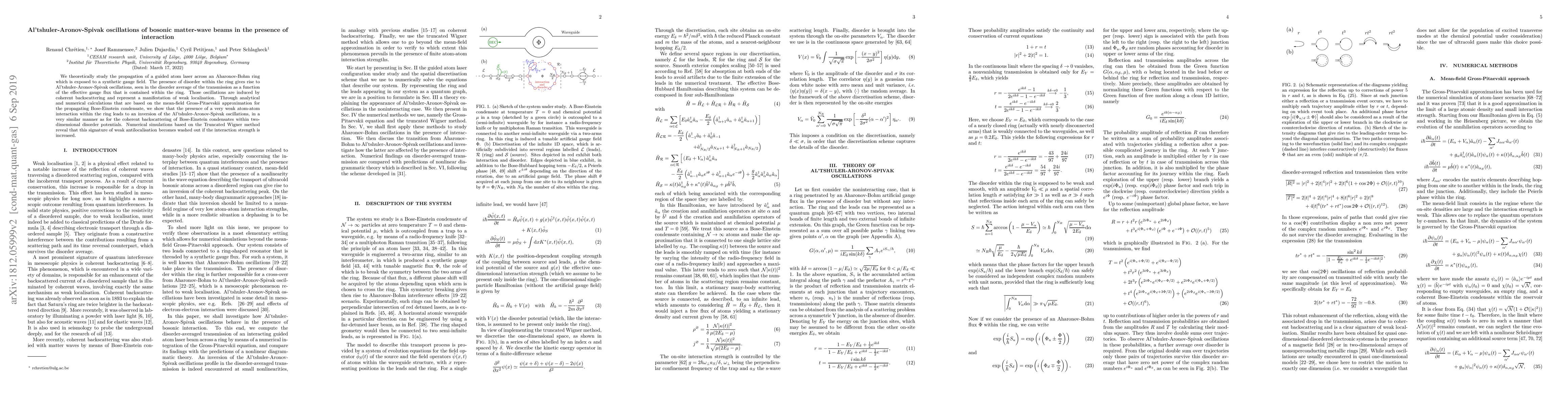 We theoretically study the propagation of a guided atom laser across an Aharonov-Bohm ring which is exposed to a synthetic gauge field. The presence of disorder within the ring gives rise to Al'tshuler-Aronov-Spivak oscillations, seen in the disorder average of the transmission as a function of the effective gauge flux that is contained within the ring. Those oscillations are induced by coherent backscattering and represent a manifestation of weak localization. Through analytical and numerical calculations that are based on the mean-field Gross-Pitaevskii approximation for the propagating Bose-Einstein condensate, we show that the presence of a very weak atom-atom interaction within the ring leads to an inversion of the Al'tshuler-Aronov-Spivak oscillations, in a very similar manner as for the coherent backscattering of Bose-Einstein condensates within two-dimensional disorder potentials. Numerical simulations based on the Truncated Wigner method reveal that this signature of weak antilocalization becomes washed out if the interaction strength is increased.