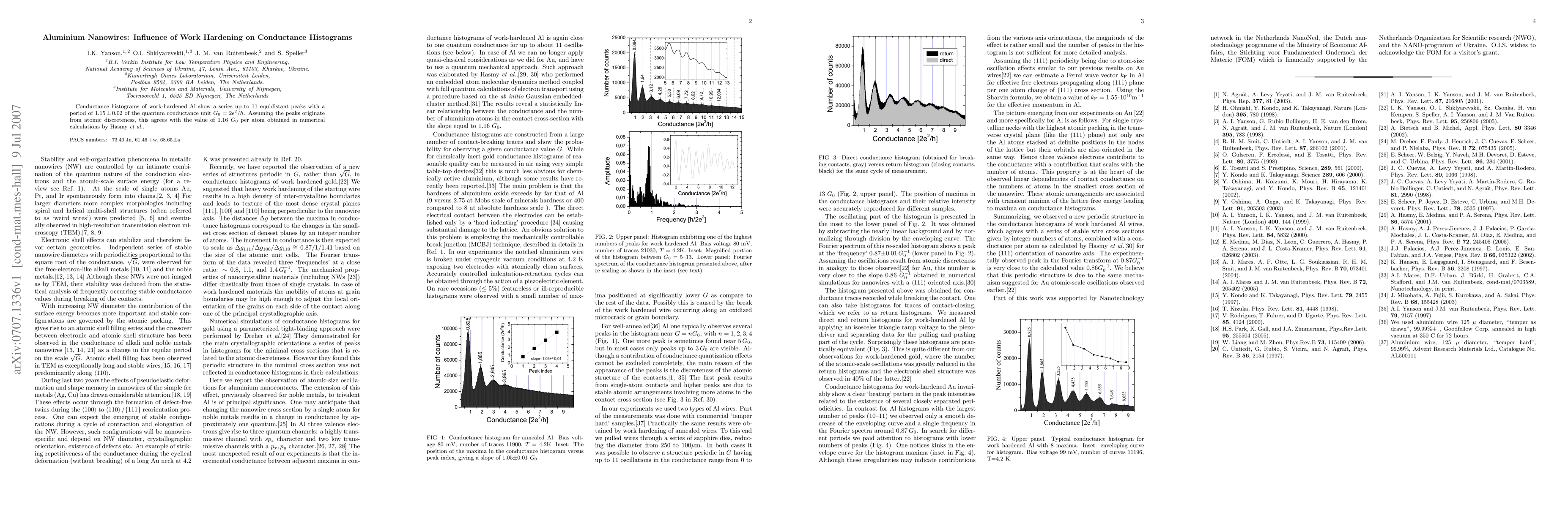 This study investigates the conductance histograms of work-hardened aluminum nanowires, revealing up to 11 equidistant peaks corresponding to the quantum conductance unit G_0. The findings align with numerical calculations suggesting 1.16 G_0 per atom, indicating the influence of atomic discreteness on conductance.