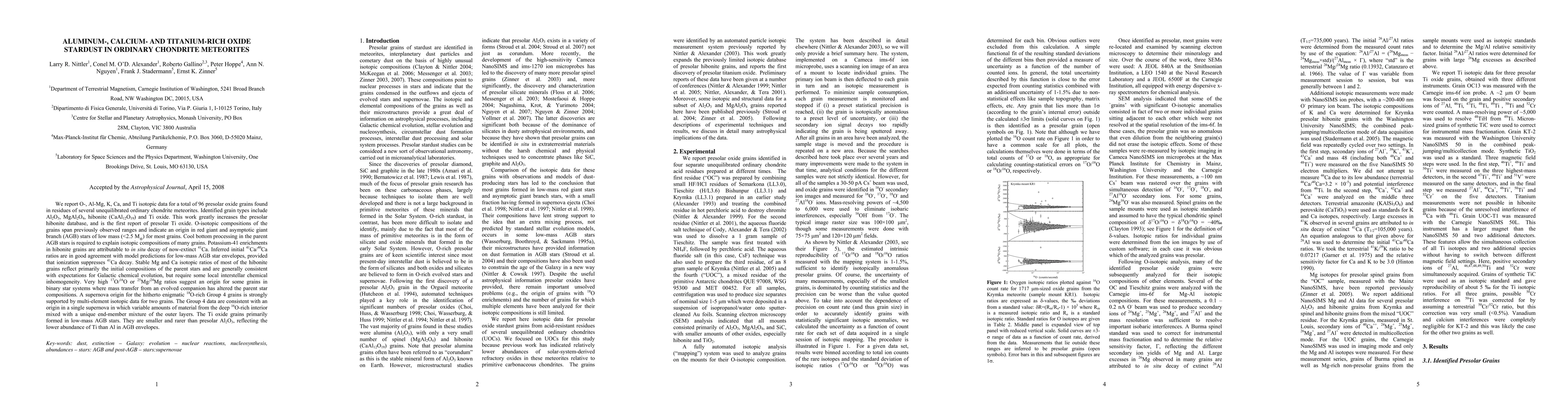 We report isotopic data for a total of 96 presolar oxide grains found in residues of several unequilibrated ordinary chondrite meteorites. Identified grain types include Al2O3, MgAl2O4, hibonite (CaAl12O19) and Ti oxide. This work greatly increases the presolar hibonite database, and is the first report of presolar Ti oxide. O-isotopic compositions of the grains span previously observed ranges and indicate an origin in red giant and asymptotic giant branch (AGB) stars of low mass (<2.5 MSun) for most grains. Cool bottom processing in the parent AGB stars is required to explain isotopic compositions of many grains. Potassium-41 enrichments in hibonite grains are attributable to in situ decay of now-extinct 41Ca. Inferred initial 41Ca/40Ca ratios are in good agreement with model predictions for low-mass AGB star envelopes, provided that ionization suppresses 41Ca decay. Stable Mg and Ca isotopic ratios of most of the hibonite grains reflect primarily the initial compositions of the parent stars and are generally consistent with expectations for Galactic chemical evolution, but require some local interstellar chemical inhomogeneity. Very high 17O/16O or 25Mg/24Mg ratios suggest an origin for some grains in binary star systems where mass transfer from an evolved companion has altered the parent star compositions. A supernova origin for the hitherto enigmatic 18O-rich Group 4 grains is strongly supported by multi-element isotopic data for two grains. The Group 4 data are consistent with an origin in a single supernova in which variable amounts of material from the deep 16O-rich interior mixed with a unique end-member mixture of the outer layers. The Ti oxide grains primarily formed in low-mass AGB stars. They are smaller and rarer than presolar Al2O3, reflecting the lower abundance of Ti than Al in AGB envelopes.