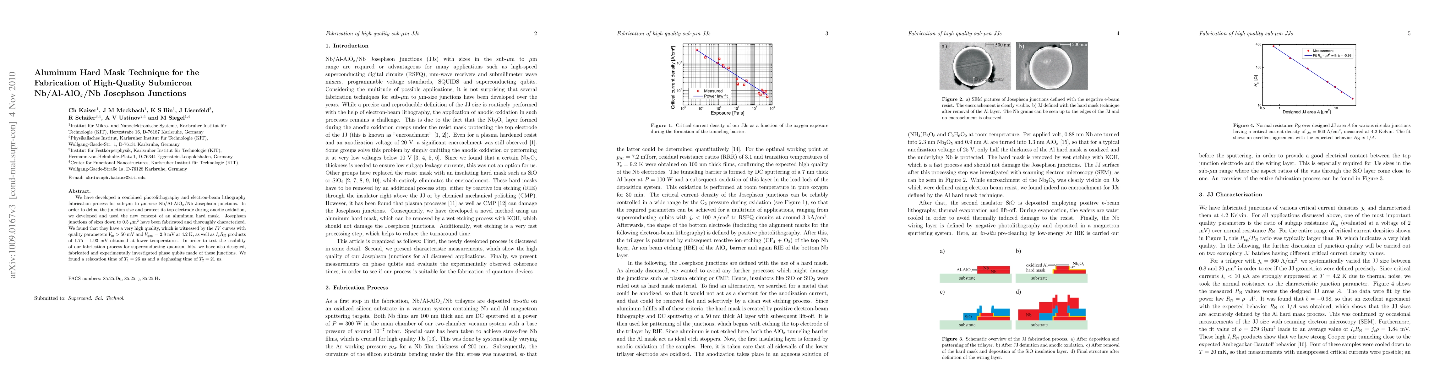 This paper describes a fabrication technique combining photolithography and electron-beam lithography to create high-quality submicron Nb/Al-AlOx/Nb Josephson junctions using an aluminum hard mask for protection, achieving sizes down to 0.5 µm² with excellent IV characteristics and potential for superconducting quantum bits, evidenced by phase qubits with T1 and T2 times of 26 ns and 21 ns respectively.