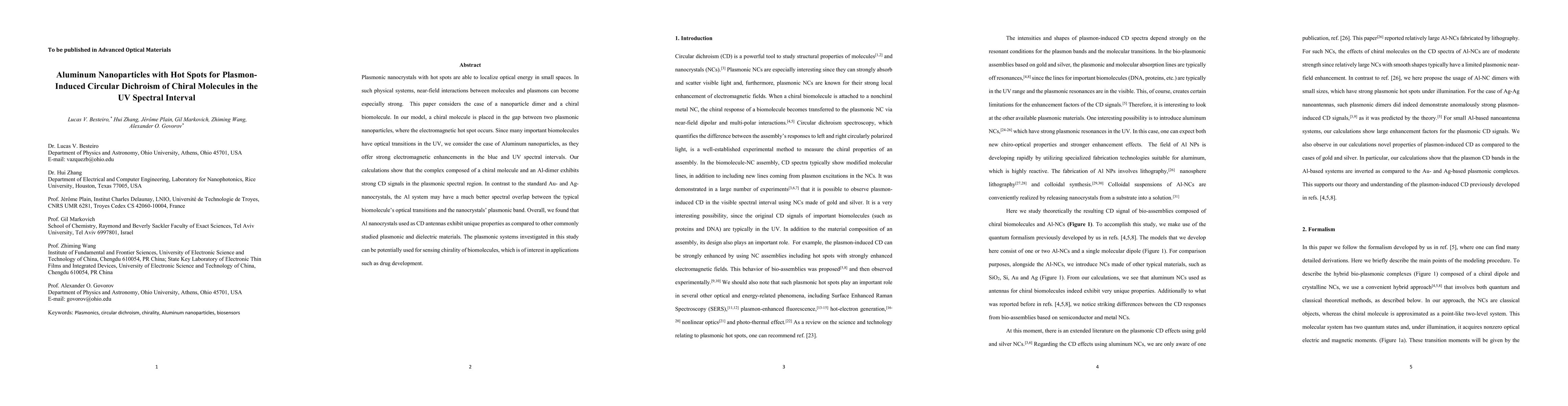 The paper presents a theoretical study on plasmon-induced CD in aluminum nanoparticle dimers with chiral biomolecules, highlighting the unique properties of Al nanocrystals for enhancing CD signals in the UV spectral interval.