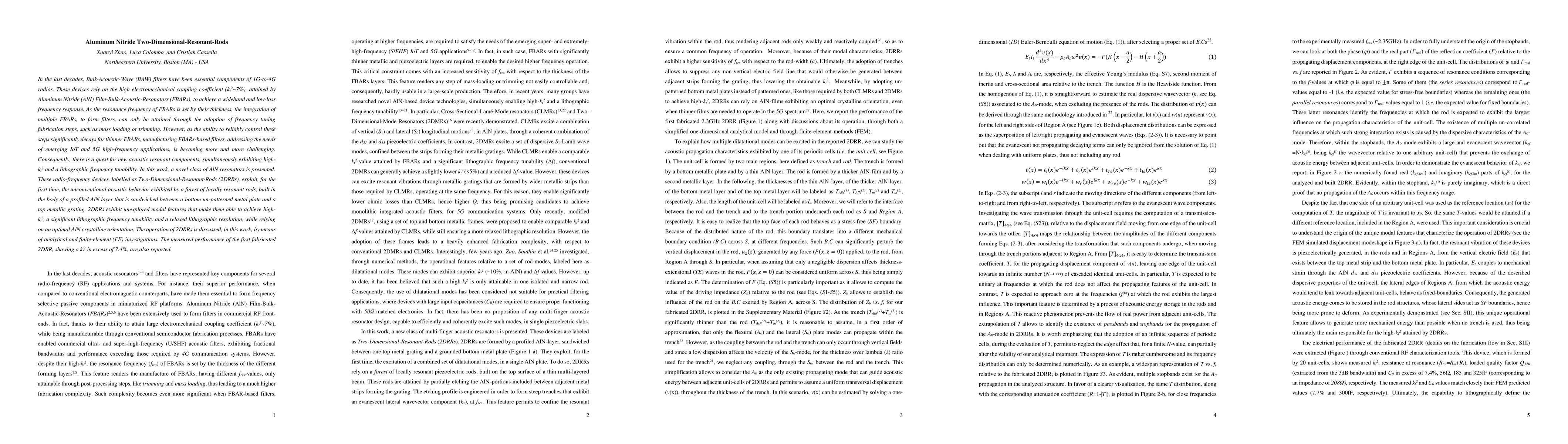 In the last decades, Bulk-Acoustic-Wave (BAW) filters have been essential components of 1G-to-4G radios. These devices rely on the high electromechanical coupling coefficient (kt2~7%), attained by Aluminum Nitride (AlN) Film-Bulk-Acoustic-Resonators (FBARs), to achieve a wideband and low-loss frequency response. As the resonance frequency of FBARs is set by their thickness, the integration of multiple FBARs, to form filters, can only be attained through the adoption of frequency tuning fabrication steps, such as mass loading or trimming. However, as the ability to reliably control these steps significantly decays for thinner FBARs, manufacturing FBARs-based filters, addressing the needs of emerging IoT and 5G high-frequency applications, is becoming more and more challenging. Consequently, there is a quest for new acoustic resonant components, simultaneously exhibiting high kt2 and a lithographic frequency tunability. In this work, a novel class of AlN resonators is presented. These radio-frequency devices, labelled as Two-Dimensional-Resonant-Rods (2DRRs), exploit, for the first time, the unconventional acoustic behavior exhibited by a forest of locally resonant rods, built in the body of a profiled AlN layer that is sandwiched between a bottom un-patterned metal plate and a top metallic grating. 2DRRs exhibit unexplored modal features that make them able to achieve high kt2, a significant lithographic frequency tunability and a relaxed lithographic resolution, while relying on an optimal AlN crystalline orientation. The operation of 2DRRs is discussed, in this work, by means of analytical and finite-element (FE) investigations. The measured performance of the first fabricated 2DRR, showing a kt2 in excess of 7.4%, are also reported.