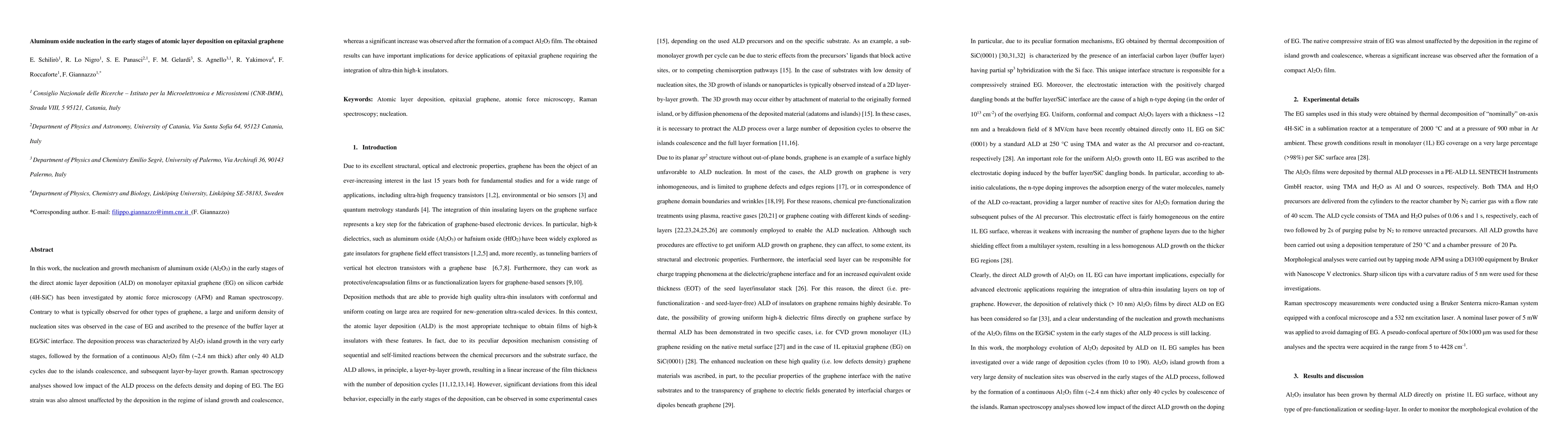 This study investigates the nucleation and growth mechanism of aluminum oxide (Al2O3) during early-stage atomic layer deposition on epitaxial graphene on silicon carbide, revealing a uniform nucleation density and minimal impact on graphene's defects and strain, with implications for high-k insulator integration in graphene devices.