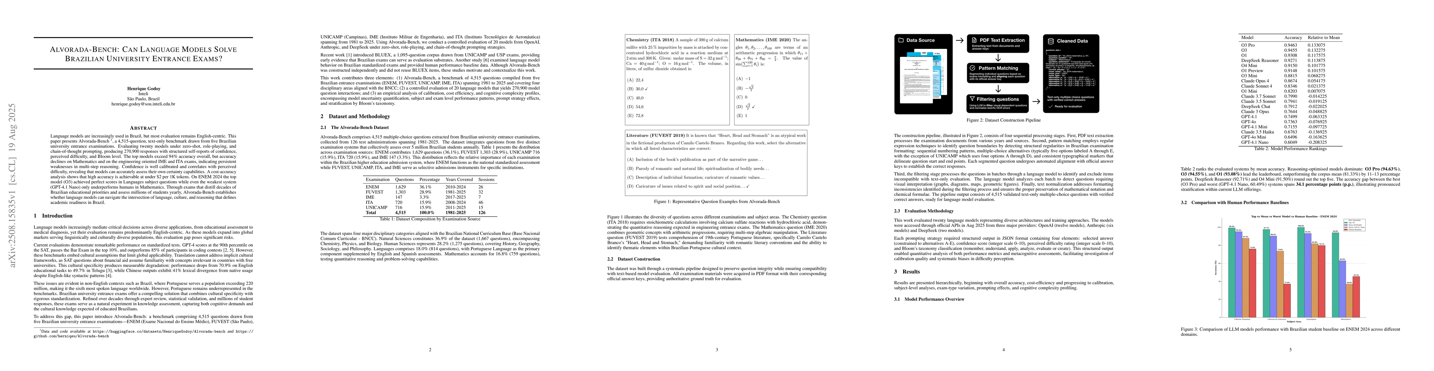 Language models are increasingly used in Brazil, but most evaluation remains English-centric. This paper presents Alvorada-Bench, a 4,515-question, text-only benchmark drawn from five Brazilian university entrance examinations. Evaluating twenty models under zero-shot, role-playing, and chain-of-thought prompting, producing 270,900 responses with structured self-reports of confidence, perceived difficulty, and Bloom level. The top models exceed 94% accuracy overall, but accuracy declines on Mathematics and on the engineering oriented IME and ITA exams, indicating persistent weaknesses in multi-step reasoning. Confidence is well calibrated and correlates with perceived difficulty, revealing that models can accurately assess their own certainty capabilities. A cost accuracy analysis shows that high accuracy is achievable at under $2 per 1K tokens. On ENEM 2024 the top model (O3) achieved perfect scores in Languages subject questions while even the weakest system (GPT-4.1 Nano) only underperforms humans in Mathematics. Through exams that distill decades of Brazilian educational priorities and assess millions of students yearly, Alvorada-Bench establishes whether language models can navigate the intersection of language, culture, and reasoning that defines academic readiness in Brazil.