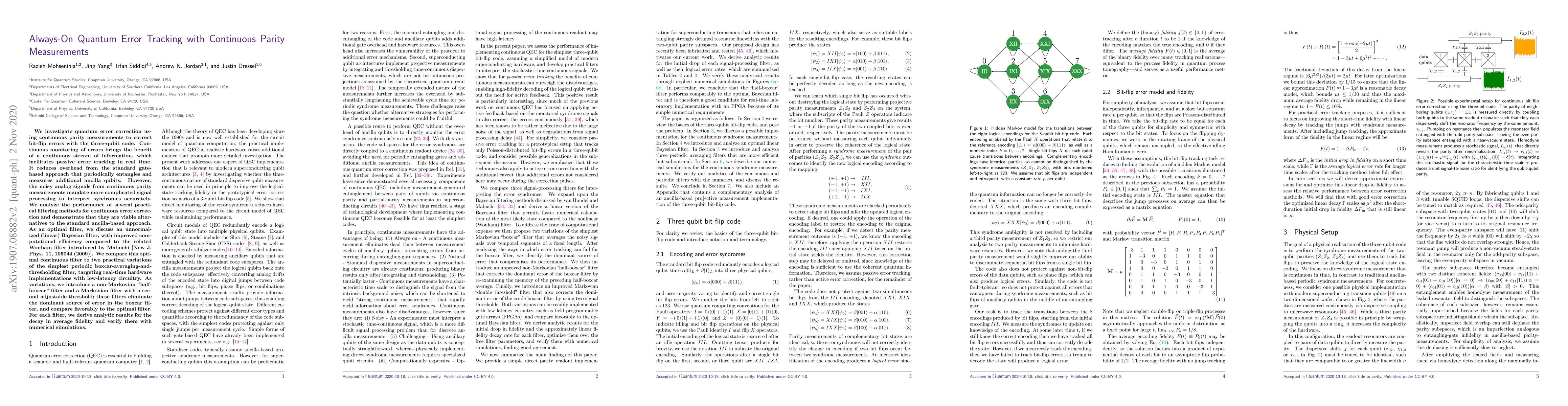 This paper explores quantum error correction using continuous parity measurements to track and correct bit-flip errors in a three-qubit code, offering real-time error tracking with reduced overhead compared to gate-based methods. It evaluates various practical filtering techniques for processing noisy signals, highlighting an optimal unnormalized Bayesian filter and comparing it to simpler boxcar-averaging filters, including a non-Markovian "half-boxcar" and a Markovian filter with an adjustable threshold.