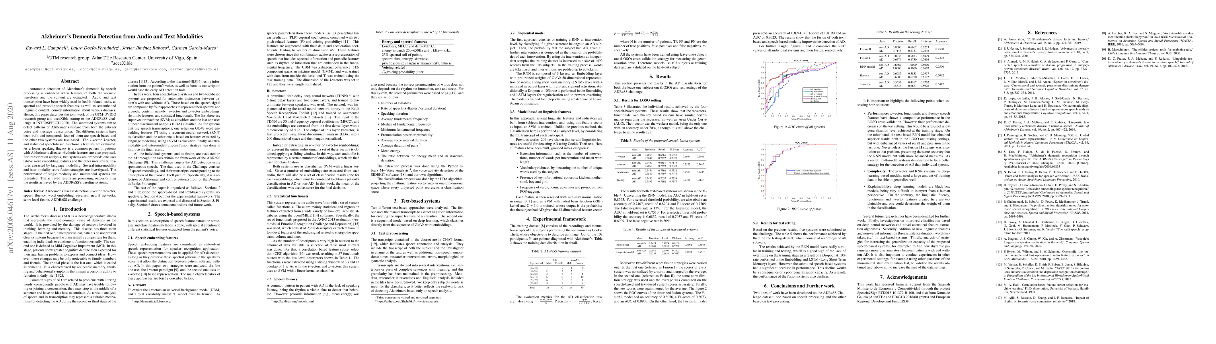 Automatic detection of Alzheimer's dementia by speech processing is enhanced when features of both the acoustic waveform and the content are extracted. Audio and text transcription have been widely used in health-related tasks, as spectral and prosodic speech features, as well as semantic and linguistic content, convey information about various diseases. Hence, this paper describes the joint work of the GTM-UVIGO research group and acceXible startup to the ADDReSS challenge at INTERSPEECH 2020. The submitted systems aim to detect patterns of Alzheimer's disease from both the patient's voice and message transcription. Six different systems have been built and compared: four of them are speech-based and the other two systems are text-based. The x-vector, i-vector, and statistical speech-based functionals features are evaluated. As a lower speaking fluency is a common pattern in patients with Alzheimer's disease, rhythmic features are also proposed. For transcription analysis, two systems are proposed: one uses GloVe word embedding features and the other uses several features extracted by language modelling. Several intra-modality and inter-modality score fusion strategies are investigated. The performance of single modality and multimodal systems are presented. The achieved results are promising, outperforming the results achieved by the ADDReSS's baseline systems.