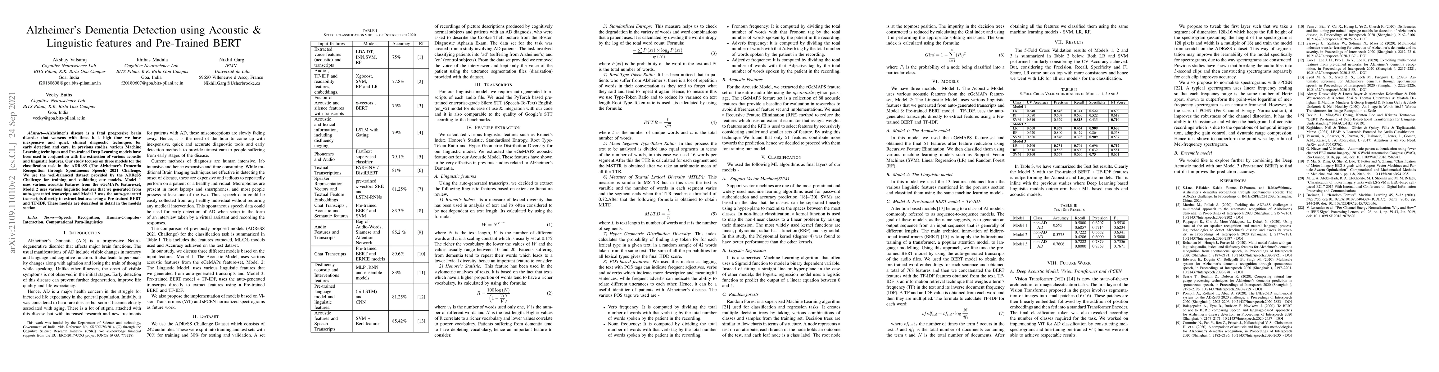 Alzheimers disease is a fatal progressive brain disorder that worsens with time. It is high time we have inexpensive and quick clinical diagnostic techniques for early detection and care. In previous studies, various Machine Learning techniques and Pre-trained Deep Learning models have been used in conjunction with the extraction of various acoustic and linguistic features. Our study focuses on three models for the classification task in the ADReSS (The Alzheimers Dementia Recognition through Spontaneous Speech) 2021 Challenge. We use the well-balanced dataset provided by the ADReSS Challenge for training and validating our models. Model 1 uses various acoustic features from the eGeMAPs feature-set, Model 2 uses various linguistic features that we generated from auto-generated transcripts and Model 3 uses the auto-generated transcripts directly to extract features using a Pre-trained BERT and TF-IDF. These models are described in detail in the models section.