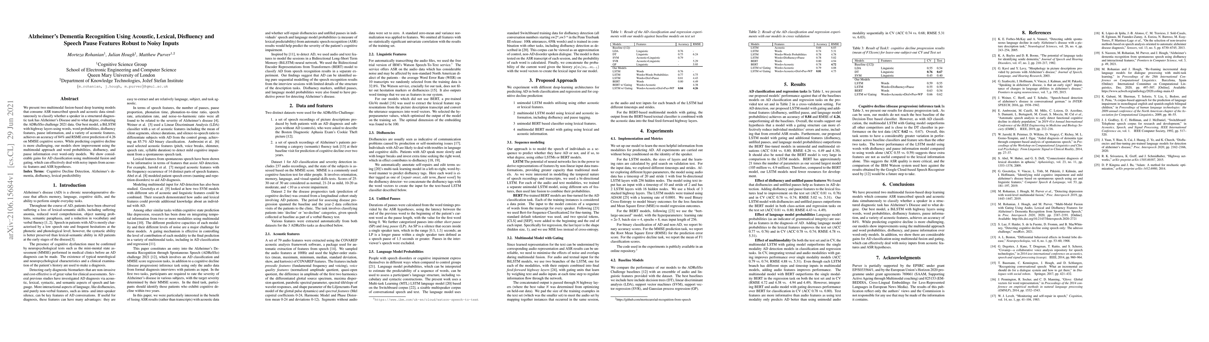 We present two multimodal fusion-based deep learning models that consume ASR transcribed speech and acoustic data simultaneously to classify whether a speaker in a structured diagnostic task has Alzheimer's Disease and to what degree, evaluating the ADReSSo challenge 2021 data. Our best model, a BiLSTM with highway layers using words, word probabilities, disfluency features, pause information, and a variety of acoustic features, achieves an accuracy of 84% and RSME error prediction of 4.26 on MMSE cognitive scores. While predicting cognitive decline is more challenging, our models show improvement using the multimodal approach and word probabilities, disfluency and pause information over word-only models. We show considerable gains for AD classification using multimodal fusion and gating, which can effectively deal with noisy inputs from acoustic features and ASR hypotheses.