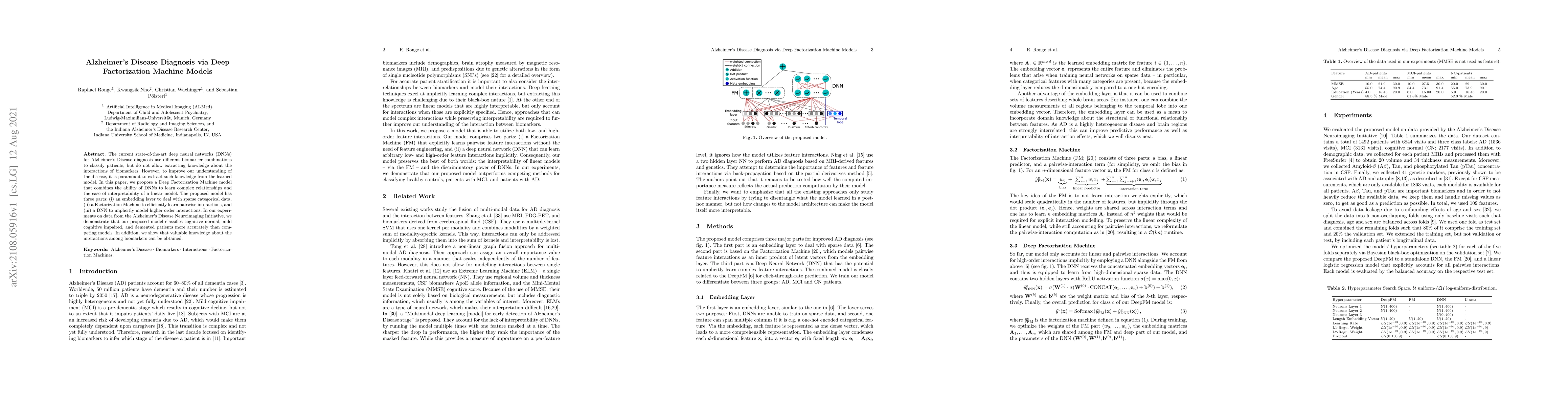 This paper proposes a Deep Factorization Machine model for Alzheimer's Disease diagnosis, combining the strengths of DNNs and linear models to learn complex interactions among biomarkers. The model achieves higher classification accuracy and provides interpretable insights into biomarker interactions.