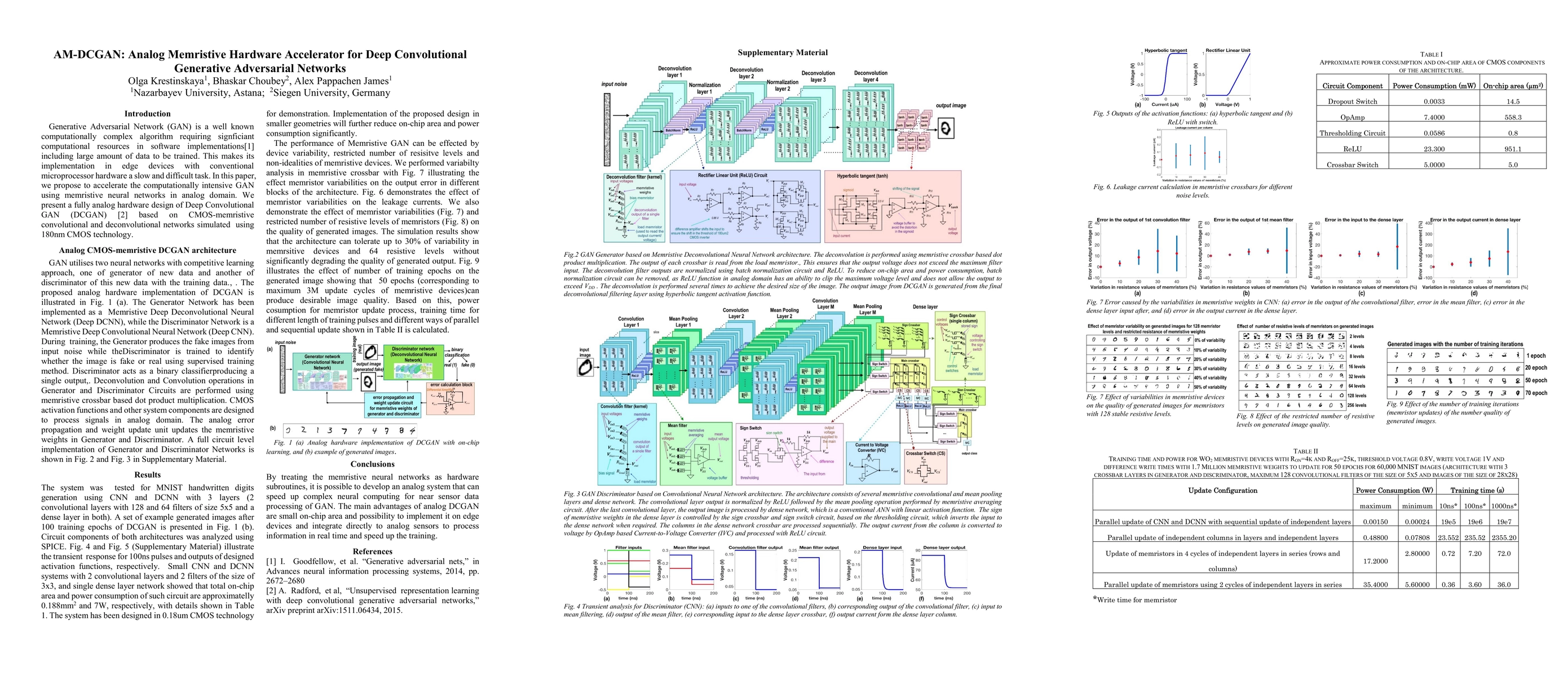 Generative Adversarial Network (GAN) is a well known computationally complex algorithm requiring signficiant computational resources in software implementations including large amount of data to be trained. This makes its implementation in edge devices with conventional microprocessor hardware a slow and difficult task. In this paper, we propose to accelerate the computationally intensive GAN using memristive neural networks in analog domain. We present a fully analog hardware design of Deep Convolutional GAN (DCGAN) based on CMOS-memristive convolutional and deconvolutional networks simulated using 180nm CMOS technology.