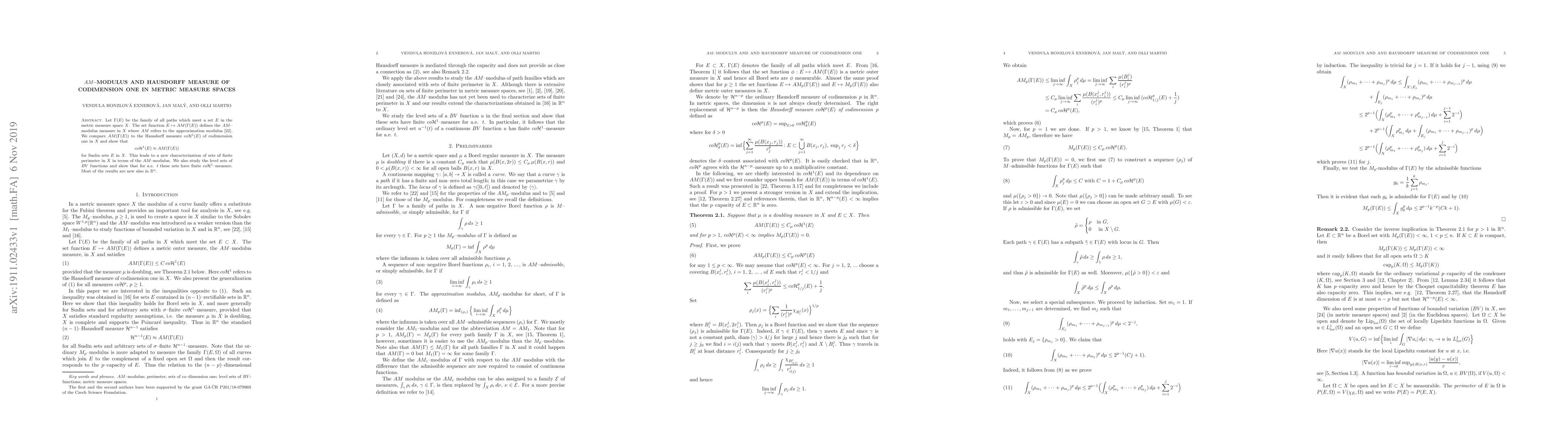 Let $\Gamma(E)$ be the family of all paths which meet a set $E$ in the metric measure space $X$. The set function $E \mapsto AM(\Gamma(E))$ defines the $AM$--modulus measure in $X$ where $AM$ refers to the approximation modulus. We compare $AM(\Gamma(E))$ to the Hausdorff measure $co\mathcal H^1(E)$ of codimension one in $X$ and show that $$co\mathcal H^1(E) \approx AM(\Gamma(E))$$ for Suslin sets $E$ in $X$. This leads to a new characterization of sets of finite perimeter in $X$ in terms of the $AM$--modulus. We also study the level sets of $BV$ functions and show that for a.e. $t$ these sets have finite $co\mathcal H^1$--measure. Most of the results are new also in $\mathbb R^n$.