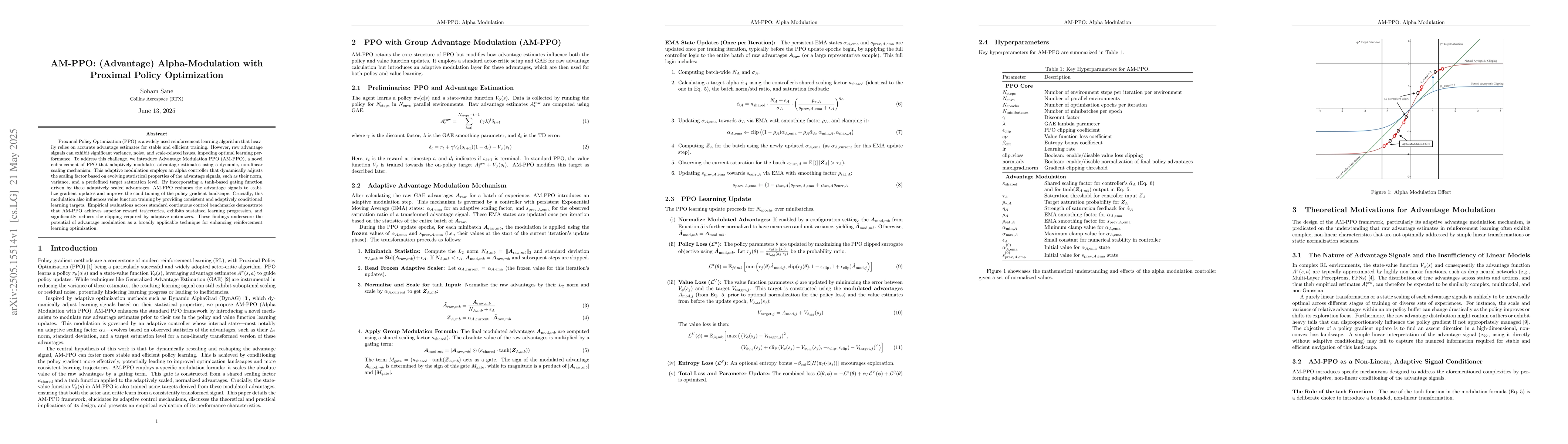 AM-PPO enhances PPO with adaptive advantage modulation for more stable learning, achieving superior reward trajectories and reduced clipping in continuous control benchmarks.