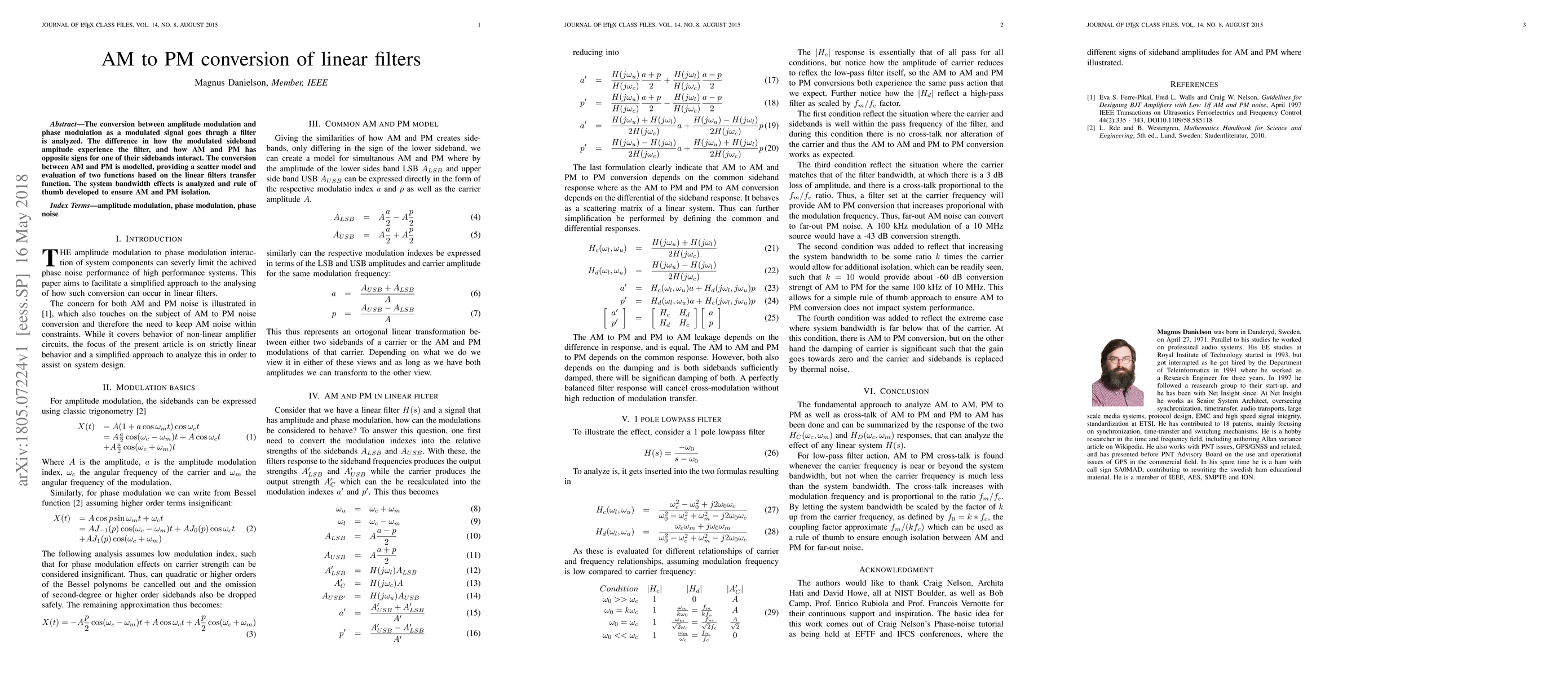 This paper analyzes the conversion between amplitude modulation (AM) and phase modulation (PM) as a signal passes through a linear filter, highlighting how the sidebands' amplitude and phase characteristics differ. It models the conversion process, evaluates two functions based on the filter's transfer function, and develops a rule of thumb to ensure AM and PM isolation, considering system bandwidth effects.