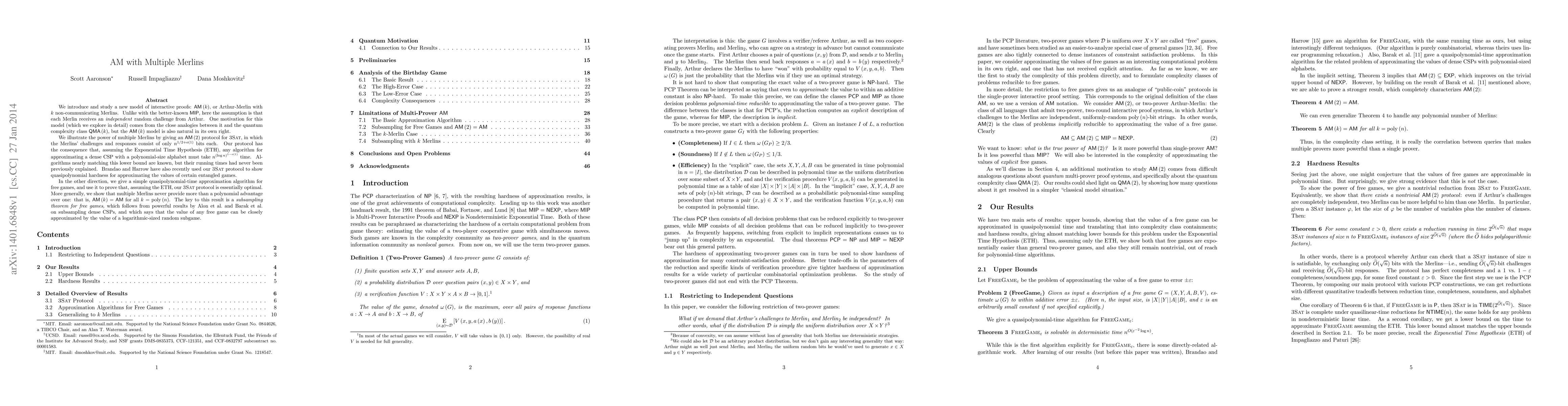 We introduce and study a new model of interactive proofs: AM(k), or Arthur-Merlin with k non-communicating Merlins. Unlike with the better-known MIP, here the assumption is that each Merlin receives an independent random challenge from Arthur. One motivation for this model (which we explore in detail) comes from the close analogies between it and the quantum complexity class QMA(k), but the AM(k) model is also natural in its own right. We illustrate the power of multiple Merlins by giving an AM(2) protocol for 3SAT, in which the Merlins' challenges and responses consist of only n^{1/2+o(1)} bits each. Our protocol has the consequence that, assuming the Exponential Time Hypothesis (ETH), any algorithm for approximating a dense CSP with a polynomial-size alphabet must take n^{(log n)^{1-o(1)}} time. Algorithms nearly matching this lower bound are known, but their running times had never been previously explained. Brandao and Harrow have also recently used our 3SAT protocol to show quasipolynomial hardness for approximating the values of certain entangled games. In the other direction, we give a simple quasipolynomial-time approximation algorithm for free games, and use it to prove that, assuming the ETH, our 3SAT protocol is essentially optimal. More generally, we show that multiple Merlins never provide more than a polynomial advantage over one: that is, AM(k)=AM for all k=poly(n). The key to this result is a subsampling theorem for free games, which follows from powerful results by Alon et al. and Barak et al. on subsampling dense CSPs, and which says that the value of any free game can be closely approximated by the value of a logarithmic-sized random subgame.