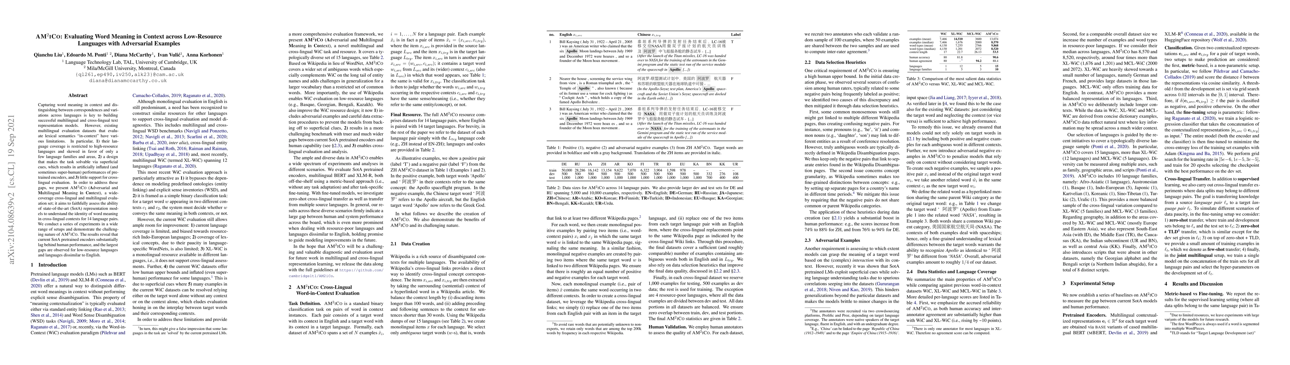 AM2iCo is a new evaluation dataset designed to assess multilingual text representation models' ability to understand word meaning in context across low-resource languages. The results show that current state-of-the-art models significantly underperform compared to human capabilities, especially for languages dissimilar to English.