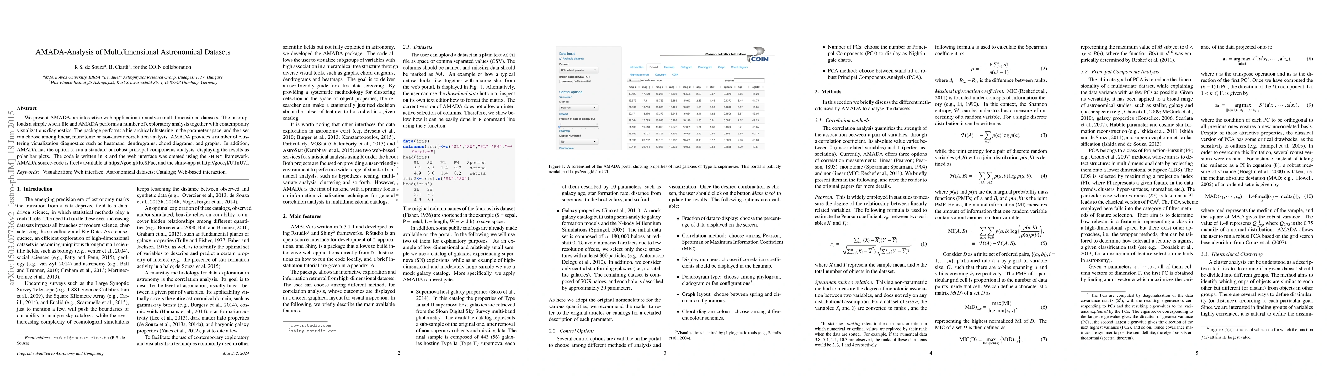 AMADA is a web application for analyzing multidimensional astronomical datasets. It offers interactive tools like hierarchical clustering, various correlation analyses, and principal components analysis, visualized through heatmaps, dendrograms, chord diagrams, and polar bar plots. The R-based application is open-source and accessible at provided links.