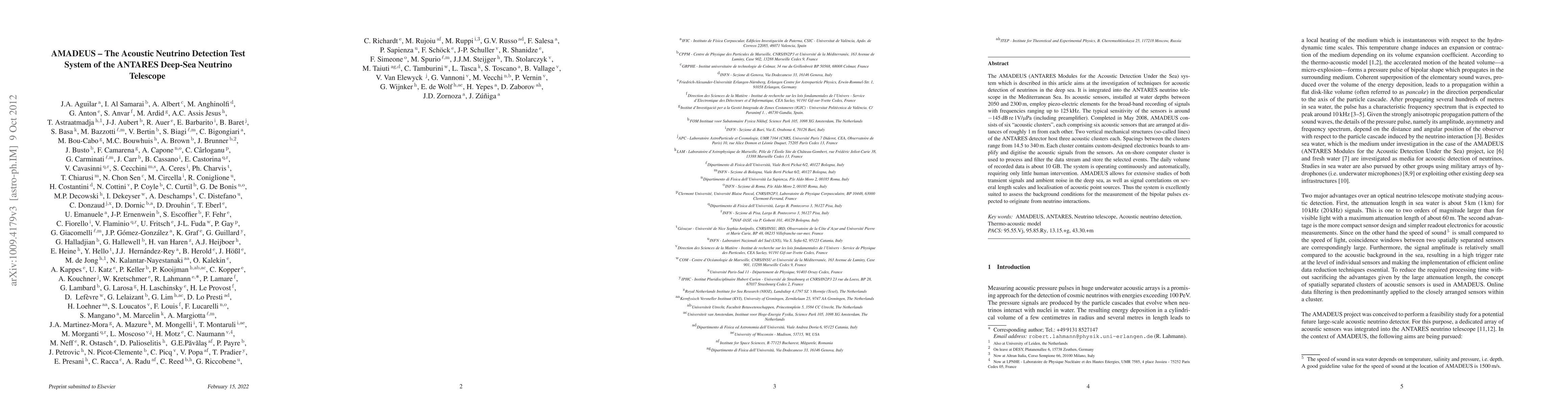 The AMADEUS system, integrated into the ANTARES deep-sea neutrino telescope, employs acoustic sensors to detect neutrinos in the Mediterranean Sea at depths of 2050-2300 m. The system consists of six acoustic clusters with custom electronics, recording data continuously and enabling studies of ambient noise and neutrino interaction signals.