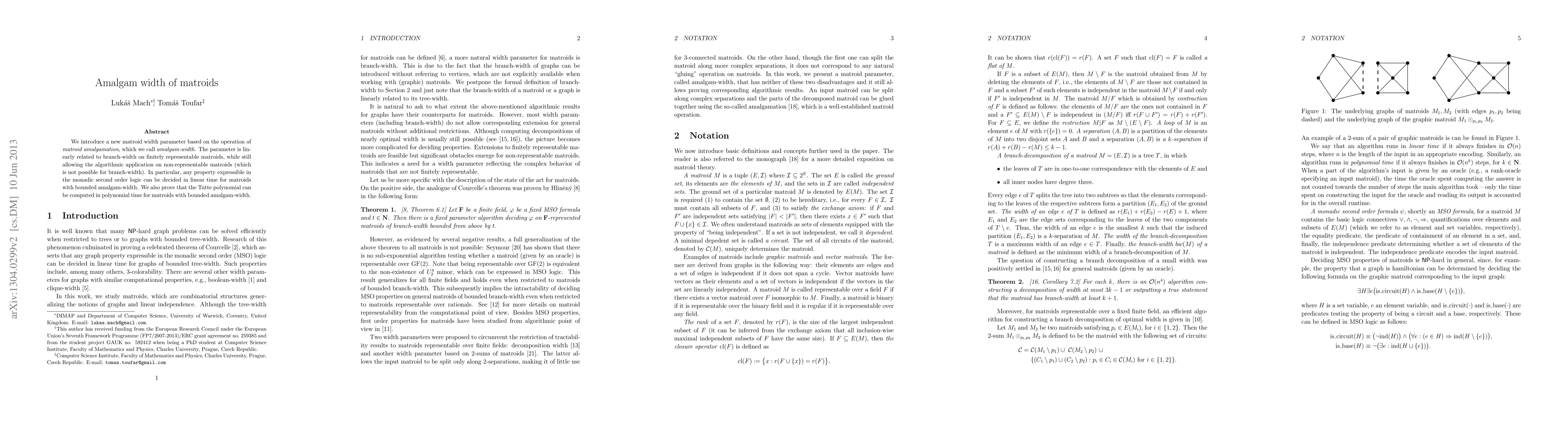 This paper introduces a new matroid width parameter called amalgam-width, which is linearly related to branch-width for finitely representable matroids. It demonstrates that properties expressible in monadic second-order logic can be decided in linear time for matroids with bounded amalgam-width, and that the Tutte polynomial can be computed in polynomial time under the same condition.