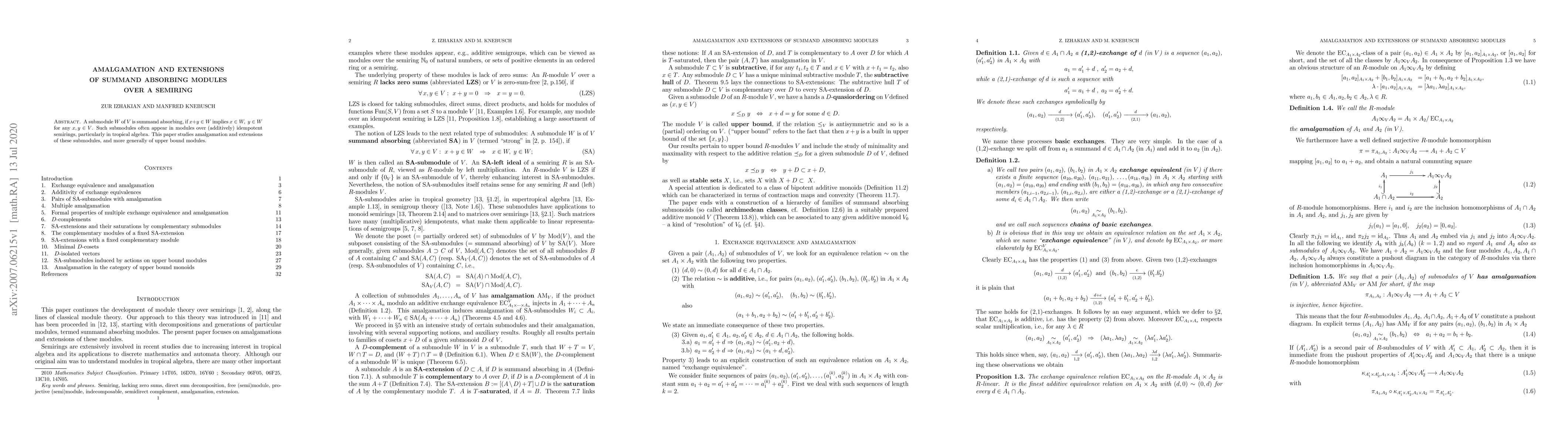 This paper investigates summand absorbing modules over semirings, focusing on their amalgamation and extensions, with potential implications for tropical algebra.
