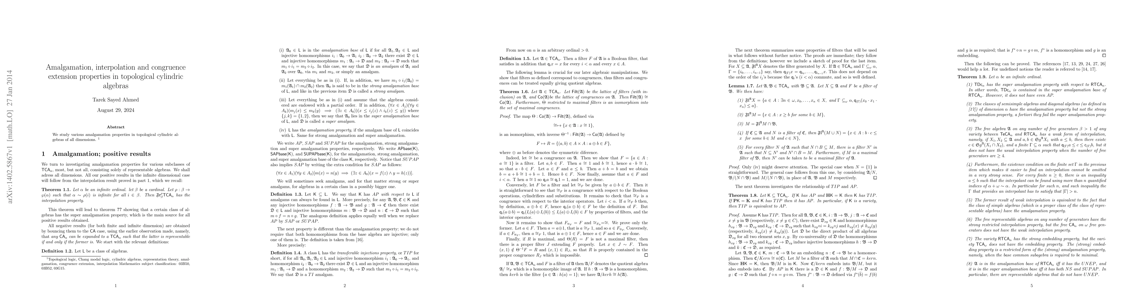 This paper explores amalgamation, interpolation, and congruence extension properties in topological cylindric algebras, which extend standard cylindric algebras with additional S4 modalities. The authors demonstrate that many known results for cylindric algebras, including those on axiomatization complexity, transfer to the topological setting through a straightforward process of adding interior identity operations.
