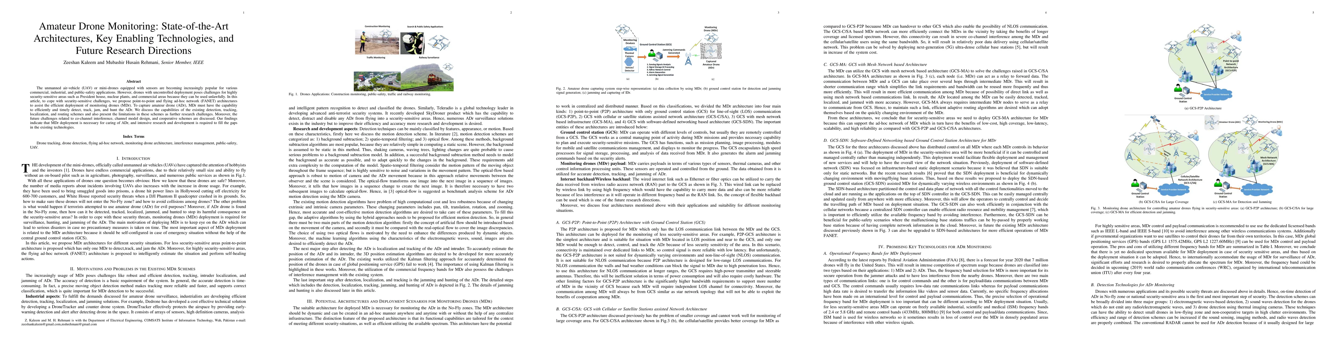 The unmanned air-vehicle (UAV) or mini-drones equipped with sensors are becoming increasingly popular for various commercial, industrial, and public-safety applications. However, drones with uncontrolled deployment poses challenges for highly security-sensitive areas such as President house, nuclear plants, and commercial areas because they can be used unlawfully. In this article, to cope with security-sensitive challenges, we propose point-to-point and flying ad-hoc network (FANET) architectures to assist the efficient deployment of monitoring drones (MDr). To capture amateur drone (ADr), MDr must have the capability to efficiently and timely detect, track, jam, and hunt the ADr. We discuss the capabilities of the existing detection, tracking, localization, and routing schemes and also present the limitations in these schemes as further research challenges. Moreover, the future challenges related to co-channel interference, channel model design, and cooperative schemes are discussed. Our findings indicate that MDr deployment is necessary for caring of ADr, and intensive research and development is required to fill the gaps in the existing technologies.