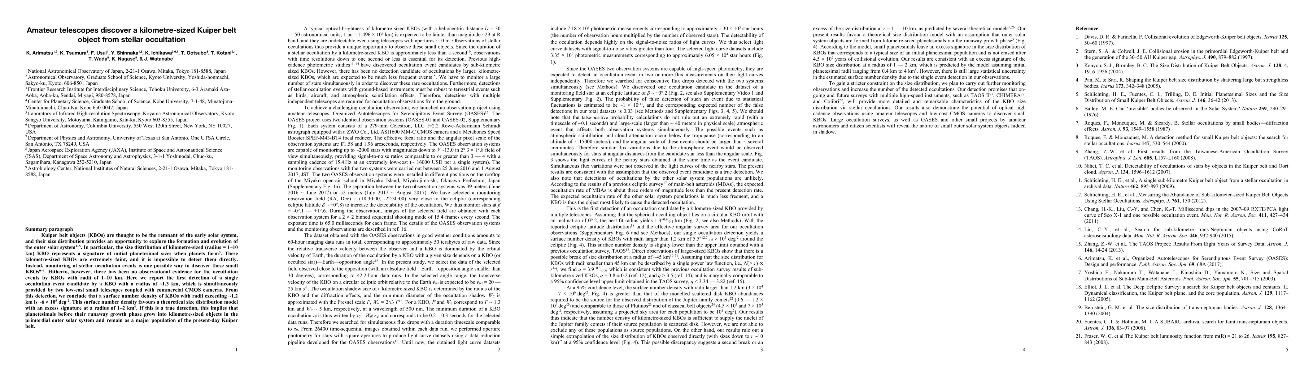 This paper reports the first detection of a kilometre-sized Kuiper belt object (radius ~1.3 km) through a stellar occultation event observed by two low-cost amateur telescopes. The findings suggest a surface number density of such objects, supporting a theoretical model with an excess at 1-2 km radii.