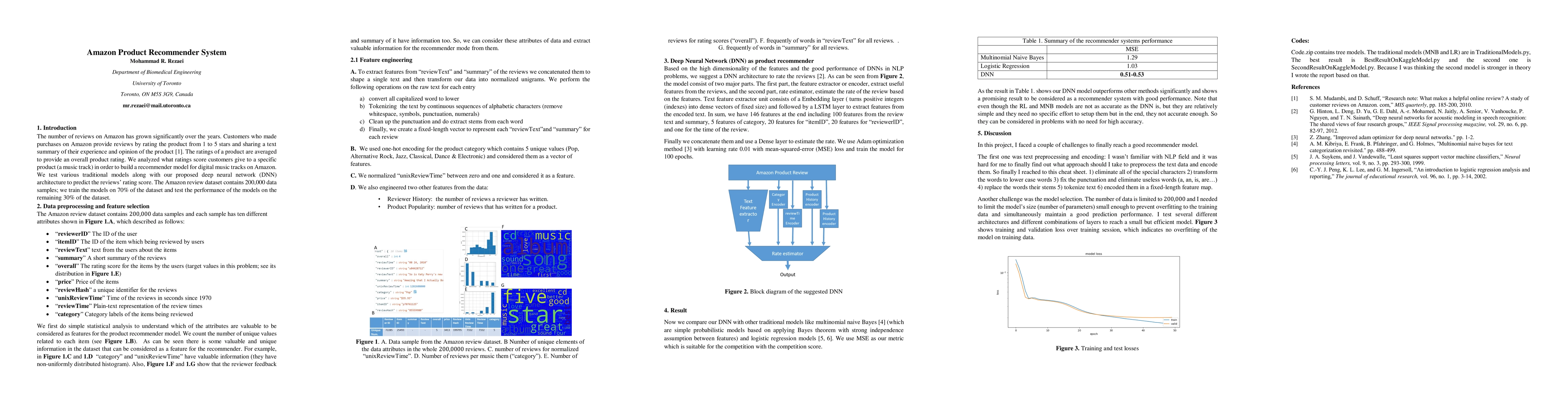 A recommender system was developed to predict Amazon review ratings for digital music tracks using a deep neural network. The model achieved significant performance improvements over traditional models.