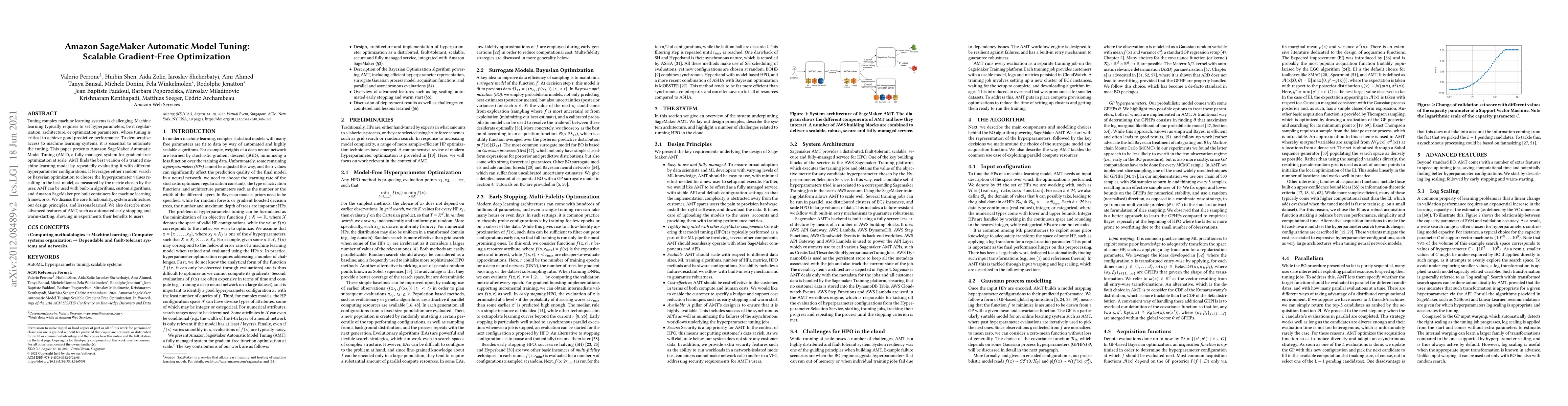 Tuning complex machine learning systems is challenging. Machine learning typically requires to set hyperparameters, be it regularization, architecture, or optimization parameters, whose tuning is critical to achieve good predictive performance. To democratize access to machine learning systems, it is essential to automate the tuning. This paper presents Amazon SageMaker Automatic Model Tuning (AMT), a fully managed system for gradient-free optimization at scale. AMT finds the best version of a trained machine learning model by repeatedly evaluating it with different hyperparameter configurations. It leverages either random search or Bayesian optimization to choose the hyperparameter values resulting in the best model, as measured by the metric chosen by the user. AMT can be used with built-in algorithms, custom algorithms, and Amazon SageMaker pre-built containers for machine learning frameworks. We discuss the core functionality, system architecture, our design principles, and lessons learned. We also describe more advanced features of AMT, such as automated early stopping and warm-starting, showing in experiments their benefits to users.