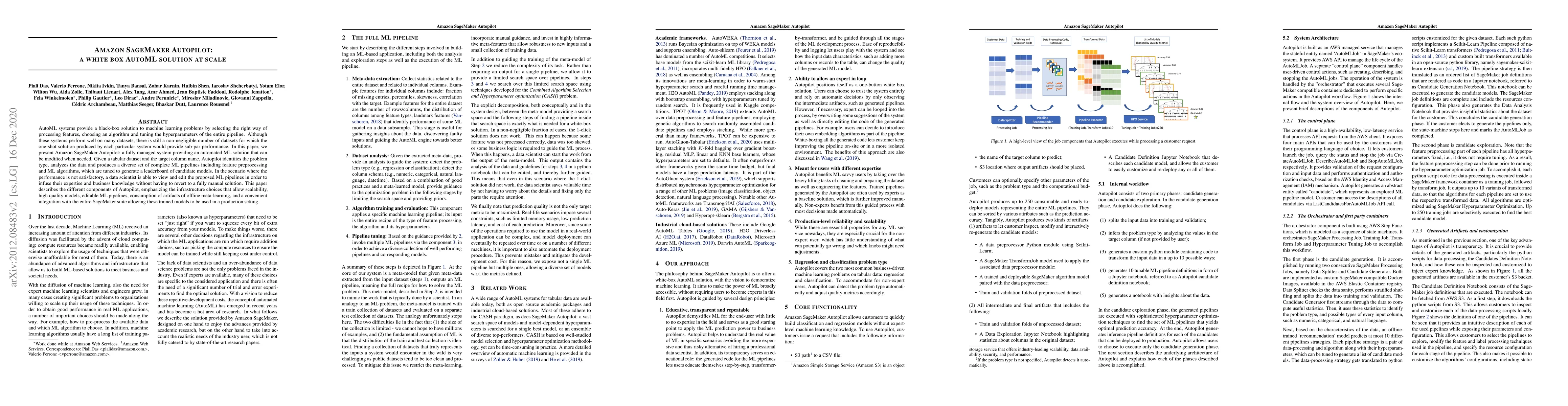 Amazon SageMaker Autopilot offers an AutoML solution that automates machine learning tasks while providing transparency and editability, allowing data scientists to enhance model performance by modifying the generated pipelines. The system scales efficiently, integrates seamlessly with SageMaker, and leverages offline meta-learning for high-quality models.