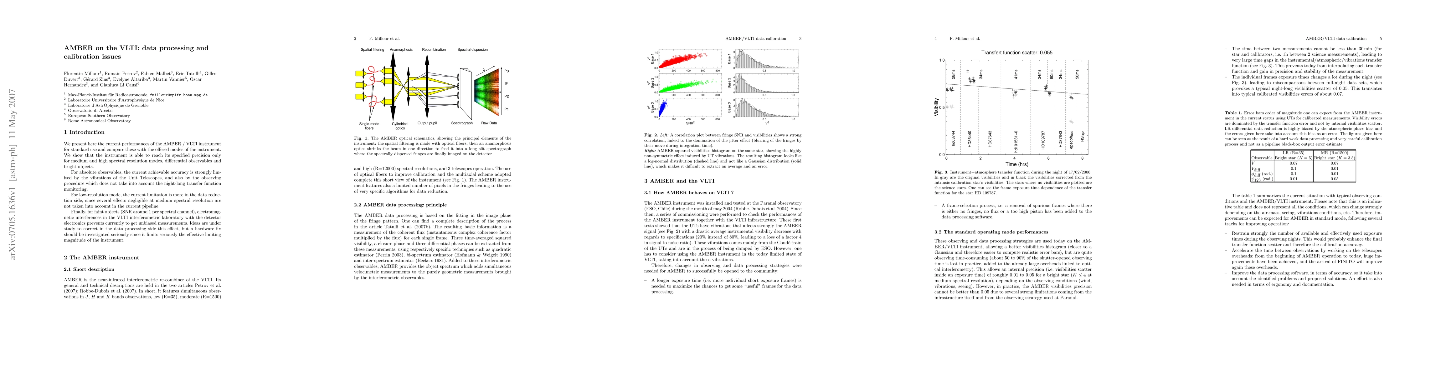 This paper evaluates the performance of the AMBER/VLTI instrument, highlighting that it achieves specified precision mainly in medium and high spectral resolution modes for bright objects. Calibration issues, including vibrations and procedural limitations, hinder absolute observables and low-resolution modes, while electromagnetic interferences restrict measurements for faint objects.