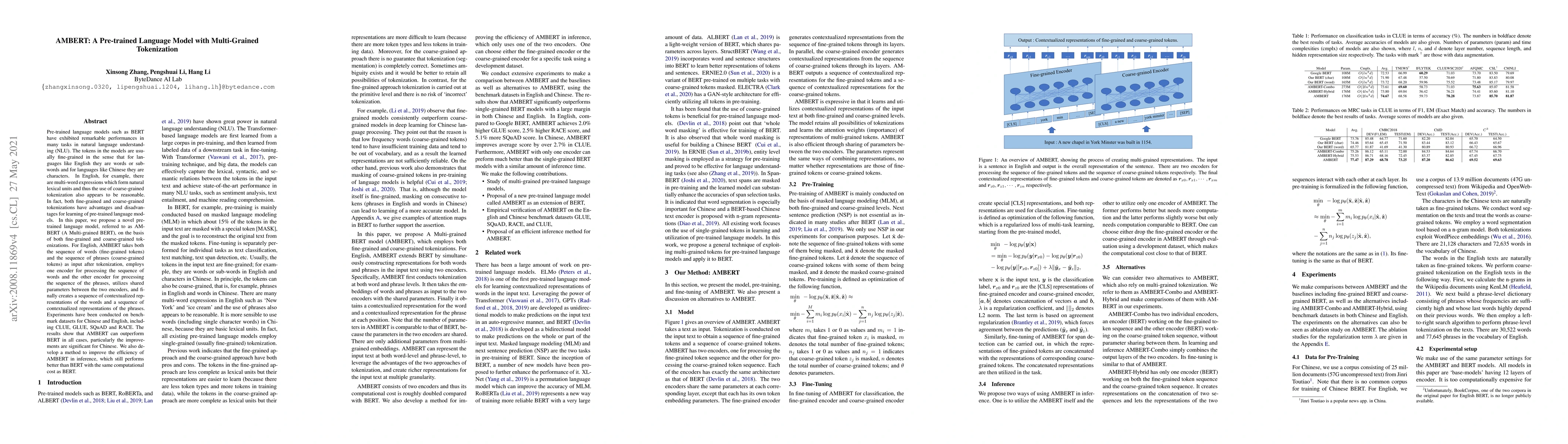 AMBERT is a novel pre-trained language model that utilizes both fine-grained and coarse-grained tokenizations to enhance performance in natural language understanding tasks. It outperforms BERT on benchmark datasets, especially for Chinese, while also improving inference efficiency.