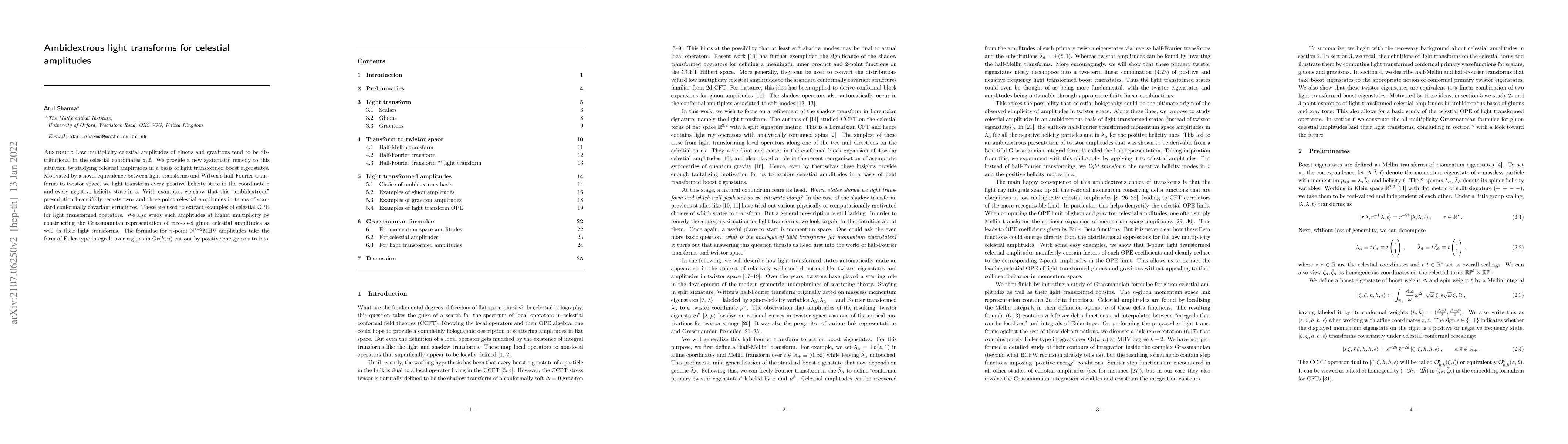 Low multiplicity celestial amplitudes of gluons and gravitons tend to be distributional in the celestial coordinates $z,\bar z$. We provide a new systematic remedy to this situation by studying celestial amplitudes in a basis of light transformed boost eigenstates. Motivated by a novel equivalence between light transforms and Witten's half-Fourier transforms to twistor space, we light transform every positive helicity state in the coordinate $z$ and every negative helicity state in $\bar z$. With examples, we show that this "ambidextrous" prescription beautifully recasts two- and three-point celestial amplitudes in terms of standard conformally covariant structures. These are used to extract examples of celestial OPE for light transformed operators. We also study such amplitudes at higher multiplicity by constructing the Grassmannian representation of tree-level gluon celestial amplitudes as well as their light transforms. The formulae for $n$-point N$^{k-2}$MHV amplitudes take the form of Euler-type integrals over regions in Gr$(k,n)$ cut out by positive energy constraints.