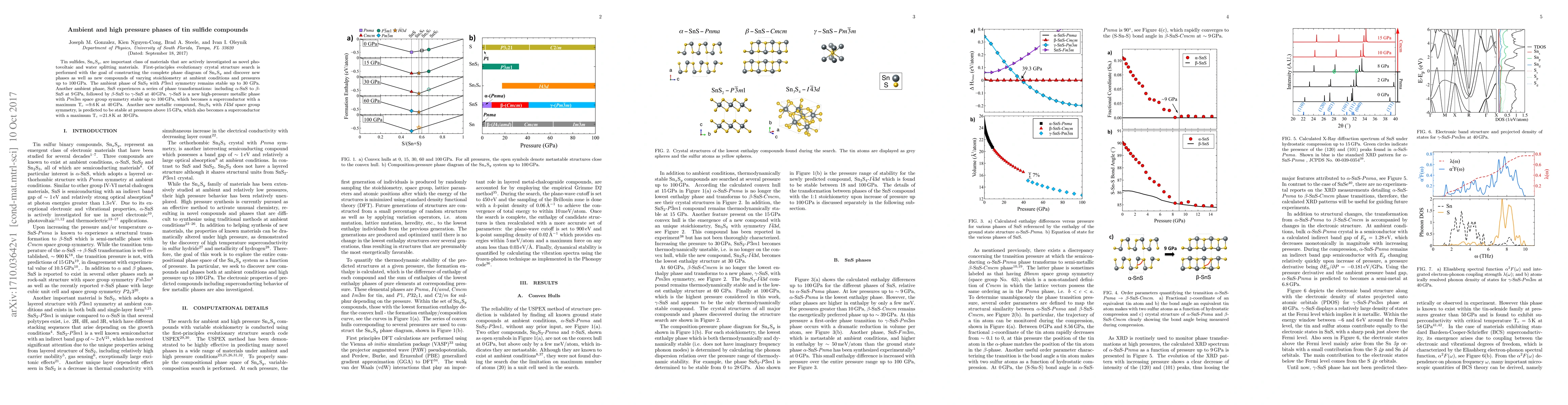 This study uses first-principles evolutionary crystal structure search to construct the phase diagram of tin sulfide compounds SnxSy, discovering new phases and compounds under ambient and high pressure conditions. Notably, SnS2 remains stable up to 30 GPa, while SnS undergoes phase transformations, culminating in a new metallic and superconducting phase at high pressures.