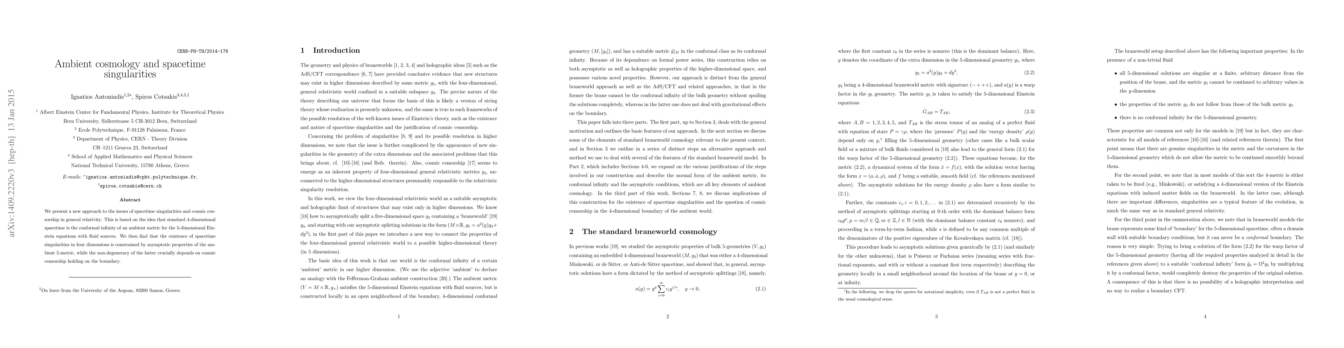 We present a new approach to the issues of spacetime singularities and cosmic censorship in general relativity. This is based on the idea that standard 4-dimensional spacetime is the conformal infinity of an ambient metric for the 5-dimensional Einstein equations with fluid sources. We then find that the existence of spacetime singularities in four dimensions is constrained by asymptotic properties of the ambient 5-metric, while the non-degeneracy of the latter crucially depends on cosmic censorship holding on the boundary.