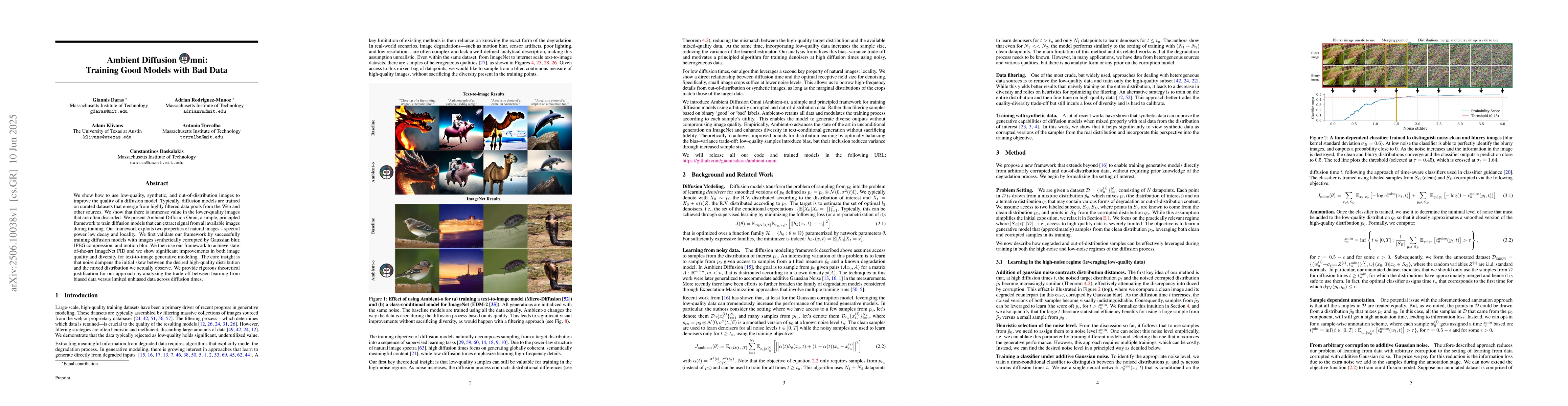 The paper introduces Ambient Diffusion Omni, a framework enabling the training of diffusion models using low-quality, synthetic, and out-of-distribution images. This method exploits natural image properties like spectral power law decay and locality to extract signal from discarded, lower-quality images, improving model quality and diversity in tasks like ImageNet and text-to-image generation. Theoretical justification supports this approach, showing its effectiveness in handling biased data compared to limited unbiased data across diffusion times.