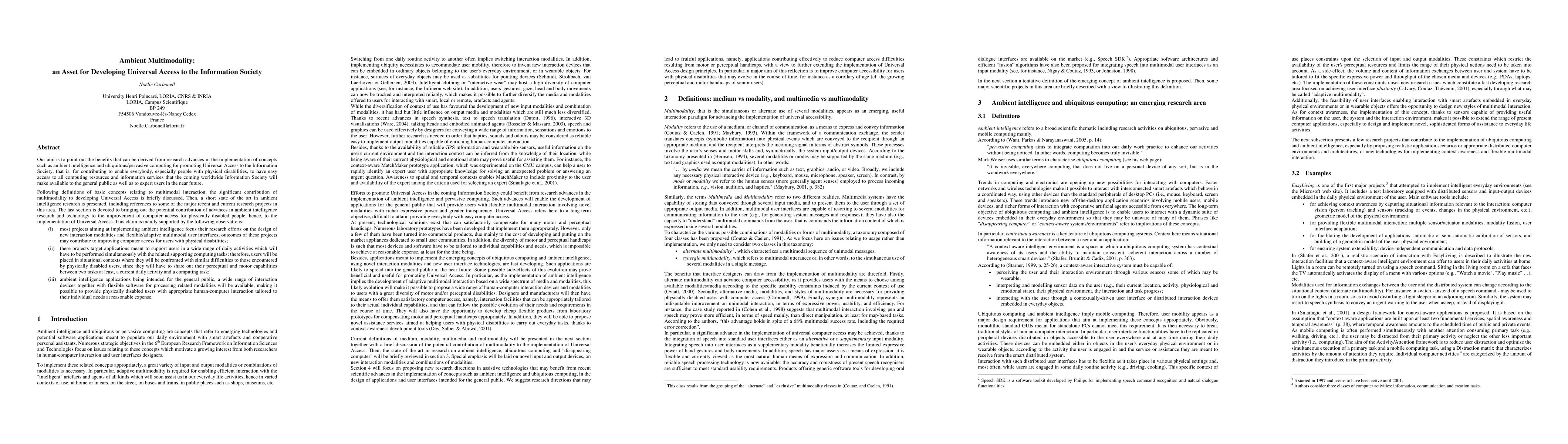 The paper tries to point out the benefits that can be derived from research advances in the implementation of concepts such as ambient intelligence (AmI) and ubiquitous or pervasive computing for promoting Universal Access (UA) to the Information Society, that is, for contributing to enable everybody, especially Physically Disabled (PD) people, to have easy access to all computing resources and information services that the coming worldwide Information Society will soon make available to the general public. Following definitions of basic concepts relating to multimodal interaction, the significant contribution of multimodality to developing UA is briefly argued. Then, a short state of the art in AmI research is presented. In the last section we bring out the potential contribution of advances in AmI research and technology to the improvement of computer access for PD people. This claim is supported by the following observations: (i) most projects aiming at implementing AmI focus on the design of new interaction modalities and flexible multimodal user interfaces which may facilitate PD users' computer access ; (ii) targeted applications will support users in a wide range of daily activities which will be performed simultaneously with supporting computing tasks; therefore, users will be placed in contexts where they will be confronted with similar difficulties to those encountered by PD users; (iii) AmI applications being intended for the general public, a wide range of new interaction devices and flexible processing software will be available, making it possible to provide PD users with human-computer facilities tailored to their specific needs at reasonable expense..