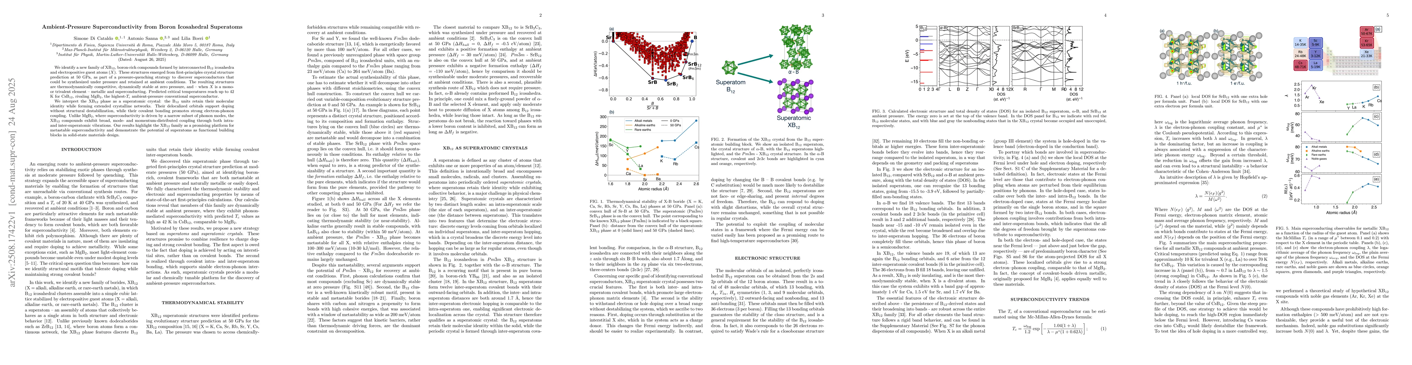 We identify a new family of XB$_{12}$, boron-rich compounds formed by interconnected B$_{12}$ icosahedra and electropositive guest atoms ($X$). These structures emerged from first-principles crystal structure prediction at 50 GPa, as part of a pressure-quenching strategy to discover superconductors that could be synthesized under pressure and retained at ambient conditions. The resulting structures are thermodynamically competitive, dynamically stable at zero pressure, and - when $X$ is a mono- or trivalent element - metallic and superconducting. Predicted critical temperatures reach up to 42 K for CsB$_{12}$, rivaling MgB$_2$, the highest-$T_c$ ambient-pressure conventional superconductor. We interpret the XB$_{12}$ phase as a superatomic crystal: the B$_{12}$ units retain their molecular identity while forming extended crystalline networks. Their delocalized orbitals support doping without structural destabilization, while their covalent bonding promotes strong electron-phonon coupling. Unlike MgB$_2$, where superconductivity is driven by a narrow subset of phonon modes, the XB$_{12}$ compounds exhibit broad, mode- and momentum-distributed coupling through both intra- and inter-superatomic vibrations. Our results highlight the XB$_{12}$ family as a promising platform for metastable superconductivity and demonstrate the potential of superatoms as functional building blocks in solid-state materials design.