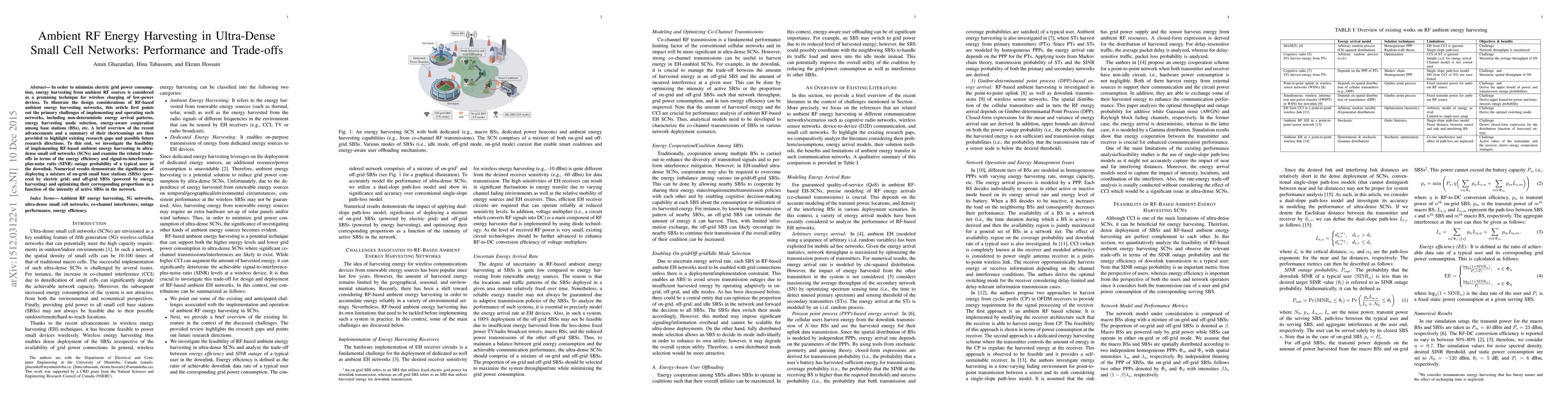 This paper explores the feasibility of RF-based ambient energy harvesting in ultra-dense small cell networks, addressing challenges like energy arrival unpredictability and energy-aware cooperation. It highlights trade-offs between energy efficiency and SINR outage probability, showing the benefits of a mixed deployment of on-grid and off-grid small base stations.