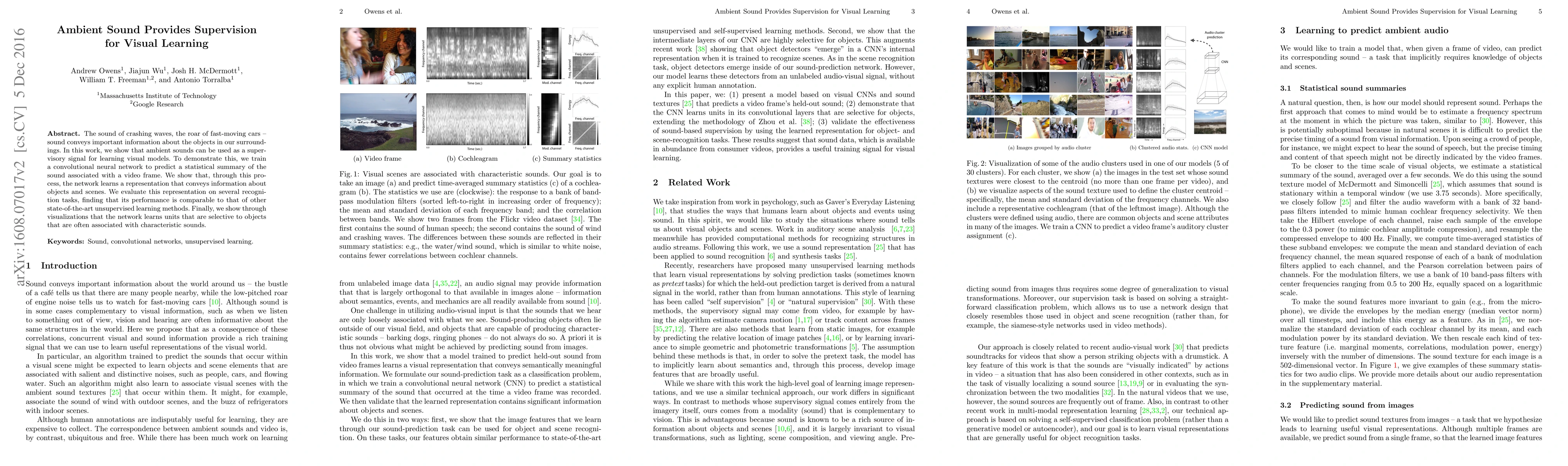 The sound of crashing waves, the roar of fast-moving cars -- sound conveys important information about the objects in our surroundings. In this work, we show that ambient sounds can be used as a supervisory signal for learning visual models. To demonstrate this, we train a convolutional neural network to predict a statistical summary of the sound associated with a video frame. We show that, through this process, the network learns a representation that conveys information about objects and scenes. We evaluate this representation on several recognition tasks, finding that its performance is comparable to that of other state-of-the-art unsupervised learning methods. Finally, we show through visualizations that the network learns units that are selective to objects that are often associated with characteristic sounds.