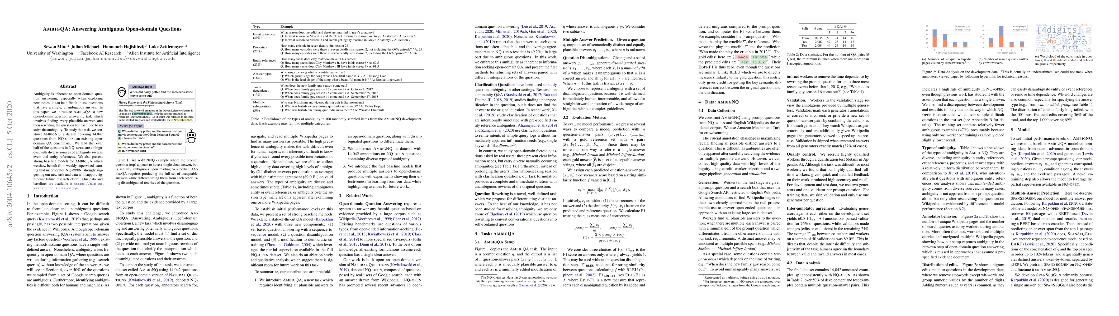 The research introduces AmbigQA, a new open-domain question answering task that involves finding all plausible answers to ambiguous questions and rewriting the question for each answer to resolve ambiguity. The dataset AmbigNQ, comprising 14,042 questions from NQ-open, was constructed to study this task.