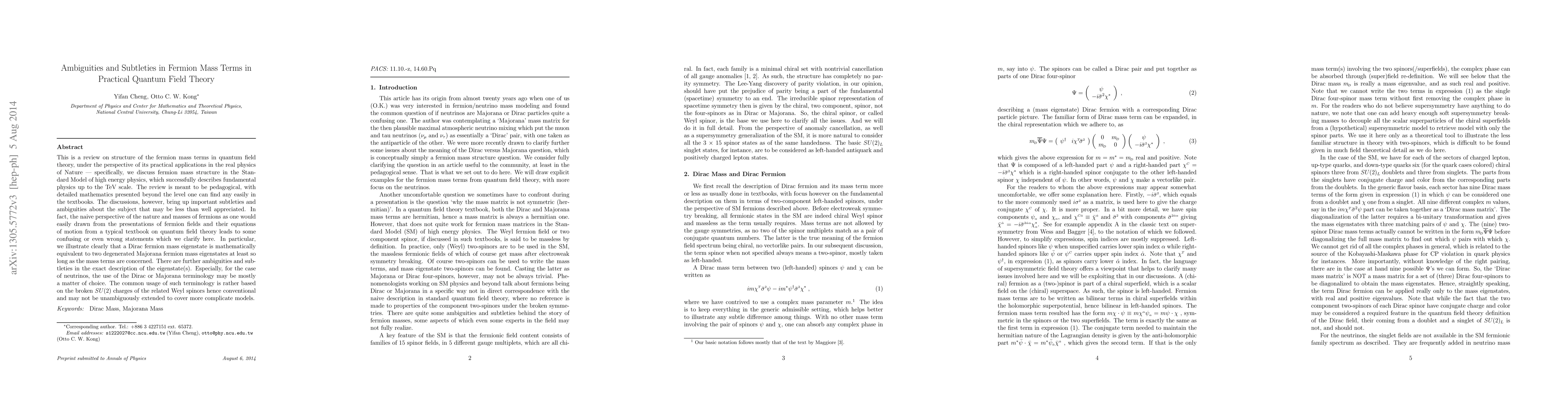 This is a review on structure of the fermion mass terms in quantum field theory, under the perspective of its practical applications in the real physics of Nature -- specifically, we discuss fermion mass structure in the Standard Model of high energy physics, which successfully describes fundamental physics up to the TeV scale. The review is meant to be pedagogical, with detailed mathematics presented beyond the level one can find any easily in the textbooks. The discussions, however, bring up important subtleties and ambiguities about the subject that may be less than well appreciated. In fact, the naive perspective of the nature and masses of fermions as one would easily drawn from the presentations of fermion fields and their equations of motion from a typical textbook on quantum field theory leads to some confusing or even wrong statements which we clarify here. In particular, we illustrate clearly that a Dirac fermion mass eigenstate is mathematically equivalent to two degenerated Majorana fermion mass eigenstates at least so long as the mass terms are concerned. There are further ambiguities and subtleties in the exact description of the eigenstate(s). Especially, for the case of neutrinos, the use of the Dirac or Majorana terminology may be mostly a matter of choice. The common usage of such terminology is rather based on the broken $SU(2)$ charges of the related Weyl spinors hence conventional and may not be unambiguously extended to cover more complicate models.